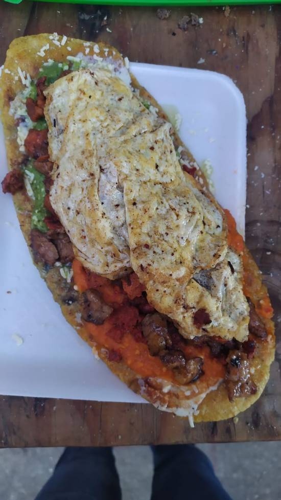 Chicharrón prensado, bistec, al pastor, jamón, salchicha, nopal, champiñones, salsa, queso y crema, acompañado de papas a la francesa y bebida a eligir puede ser: Jamaica, horchata o coca-cola.