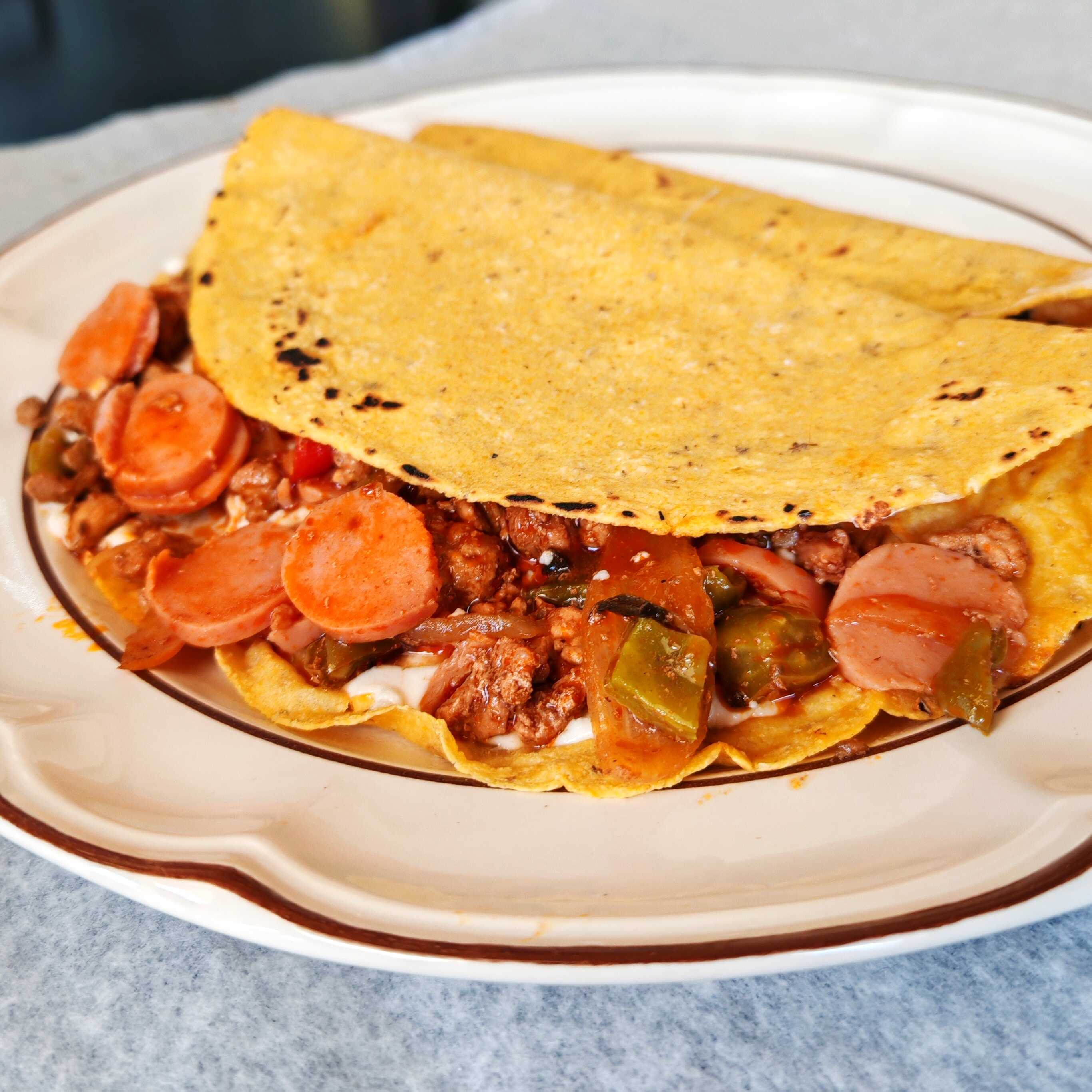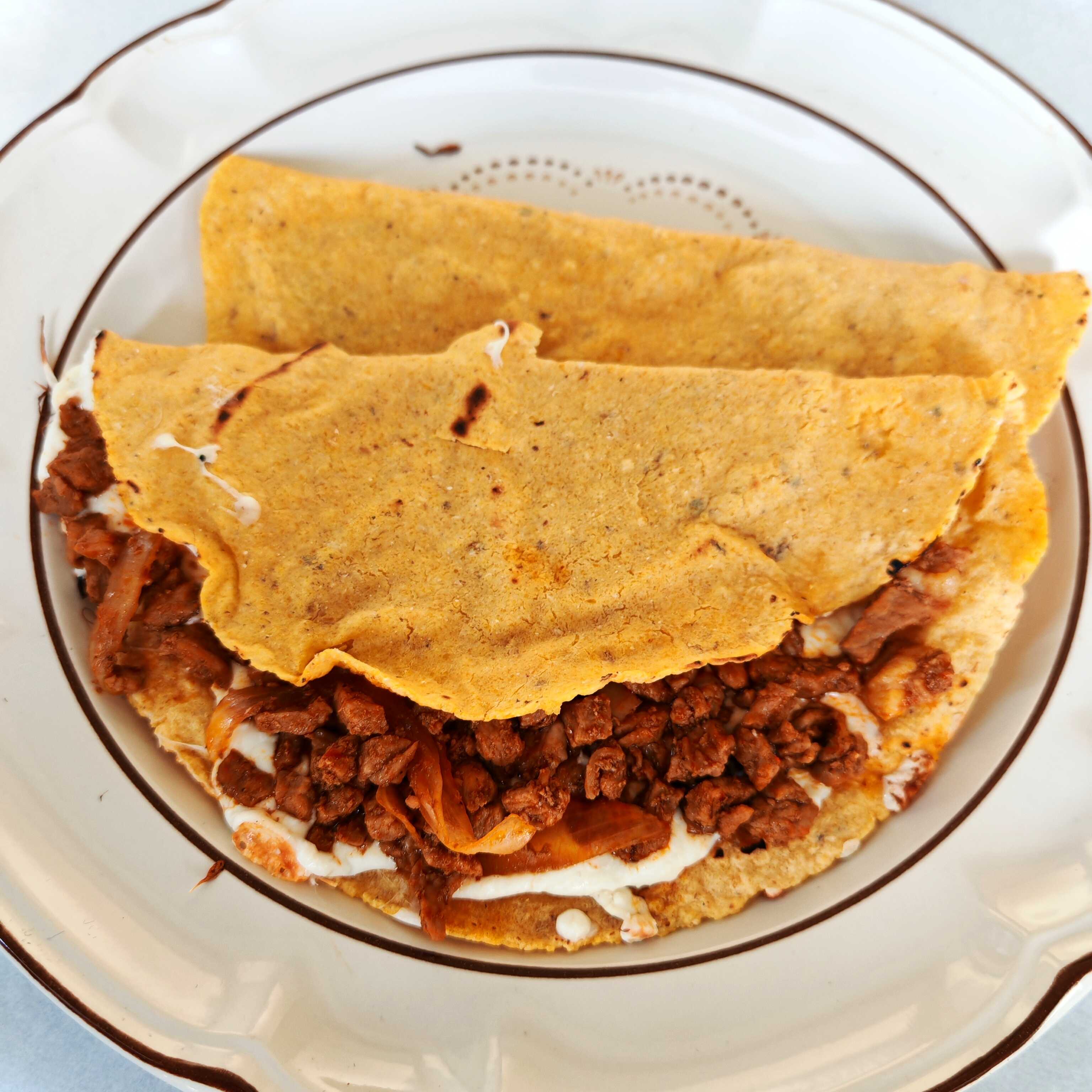 Tortilla de maíz, quesillo y carne, incluye salsa verde limón y cebolla