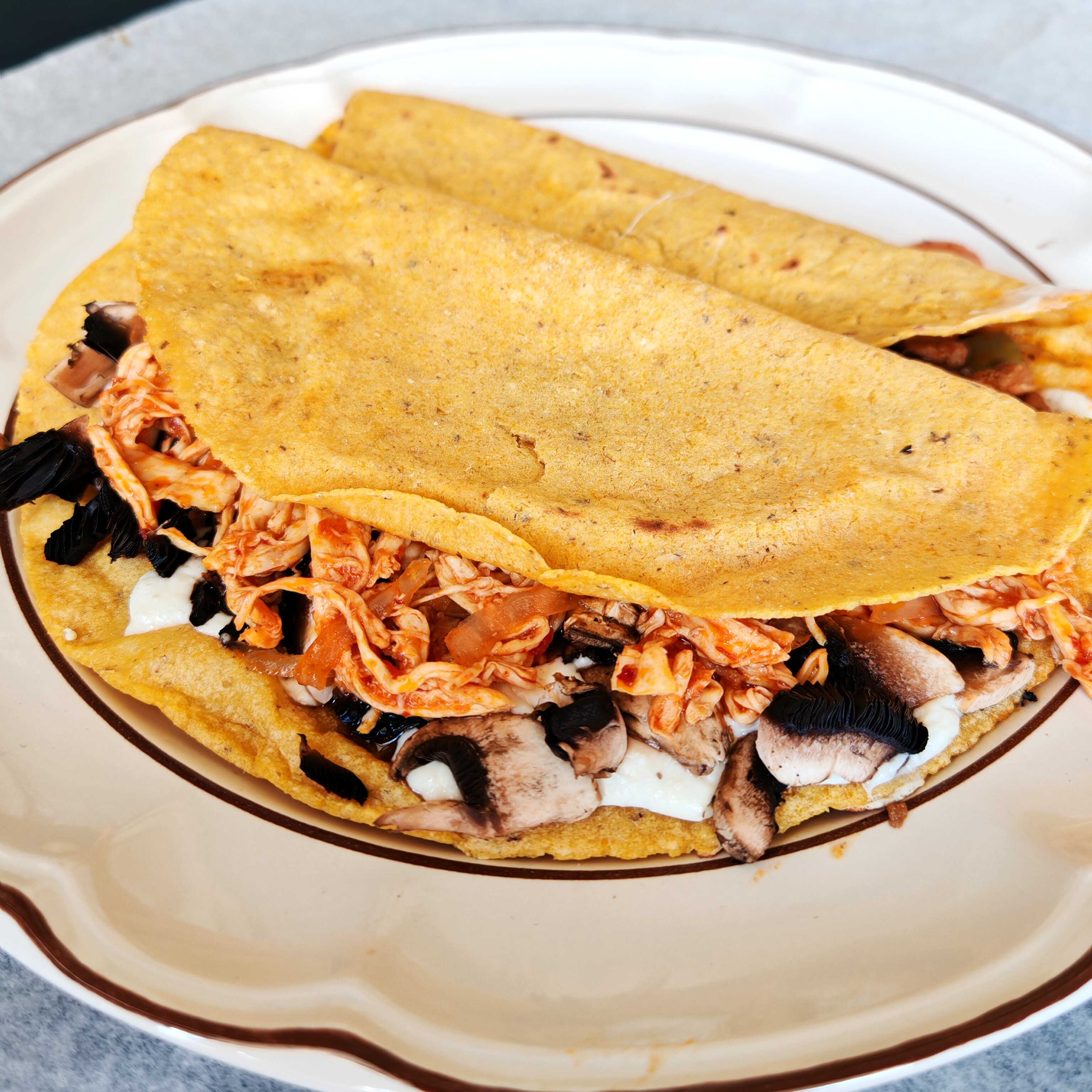 Tortilla d maíz 100%, con quesillo, incluye salsa verde, limón y cebolla morada