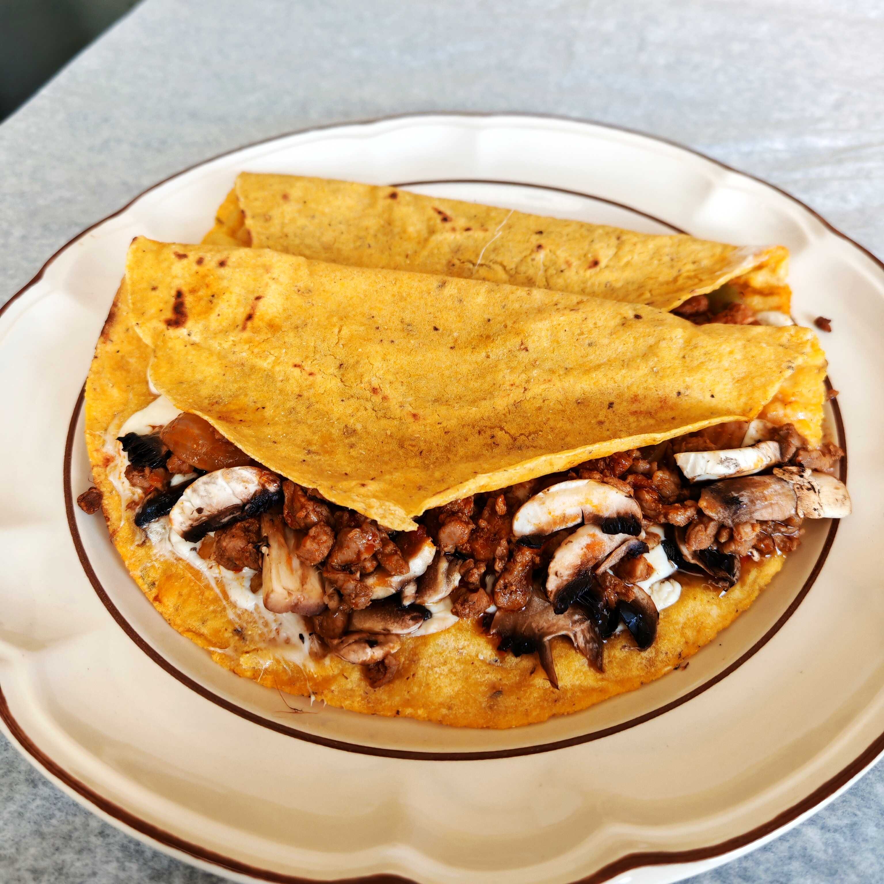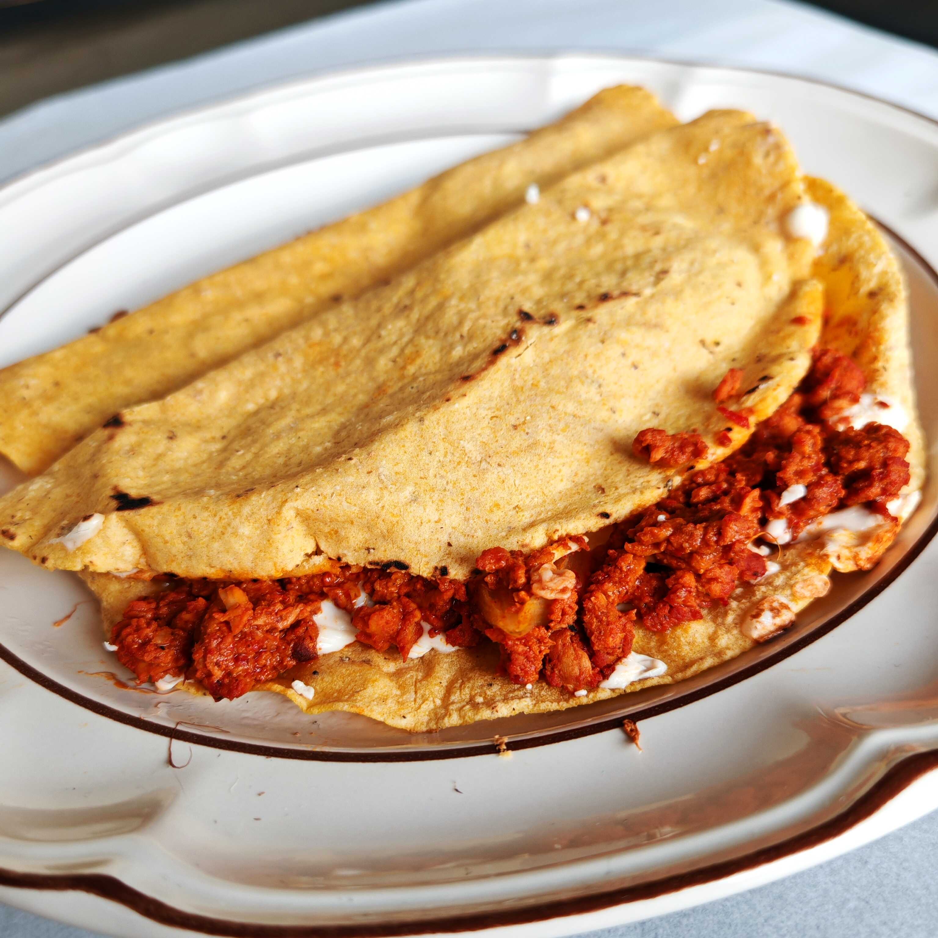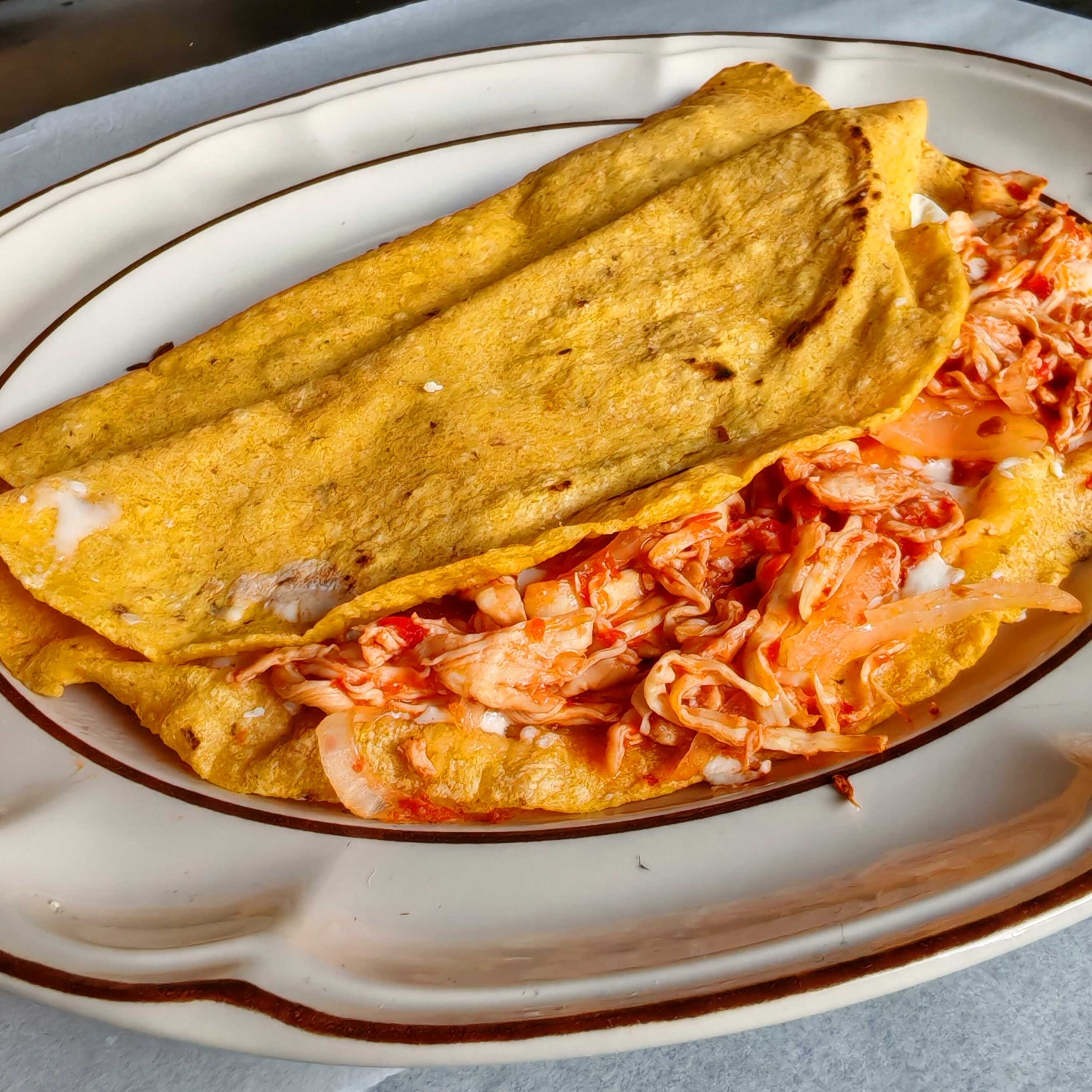 Tortilla de maíz, quesillo carne, incluye salsa, limón y cebolla