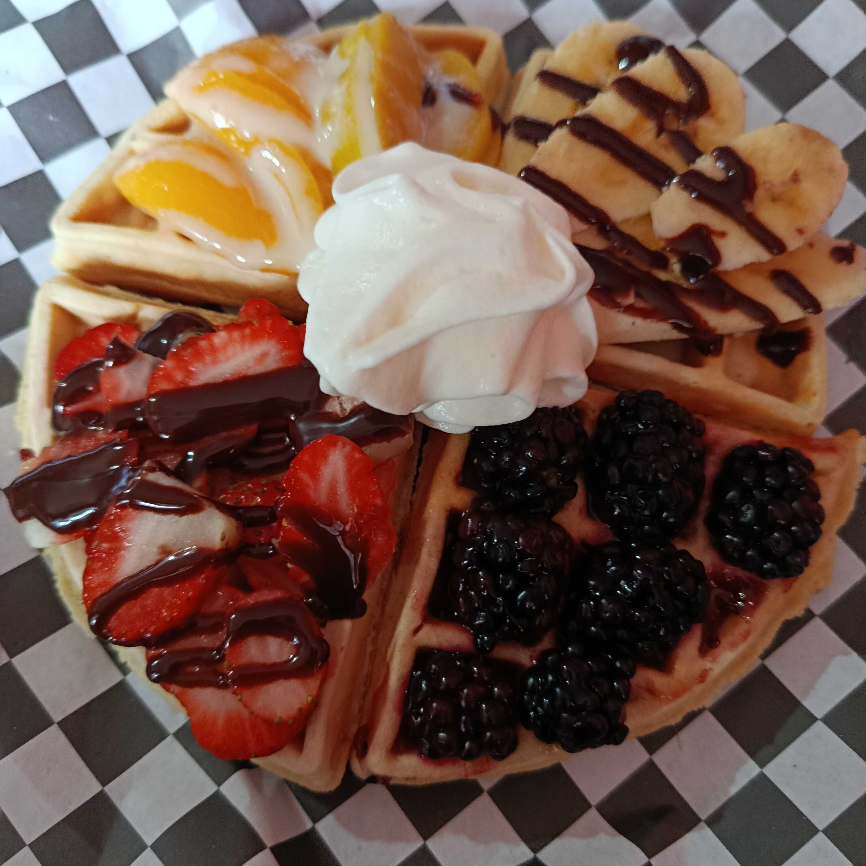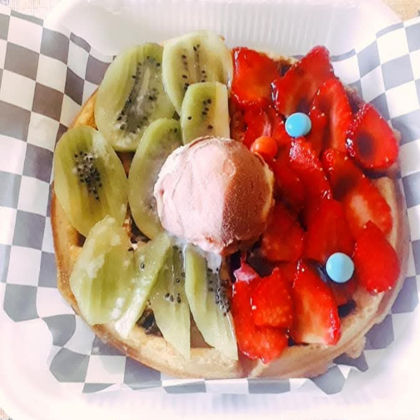 Waffle con la fruta de tu elección fresa,durazno,mora o platano
