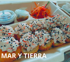 Por dentro; aguacate,pepino, Cangrejo, cubierto con Camarón, Salmón, Atún y Aguacate