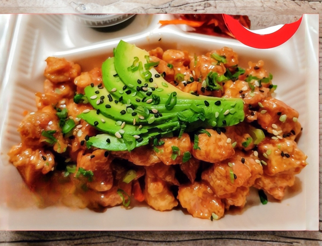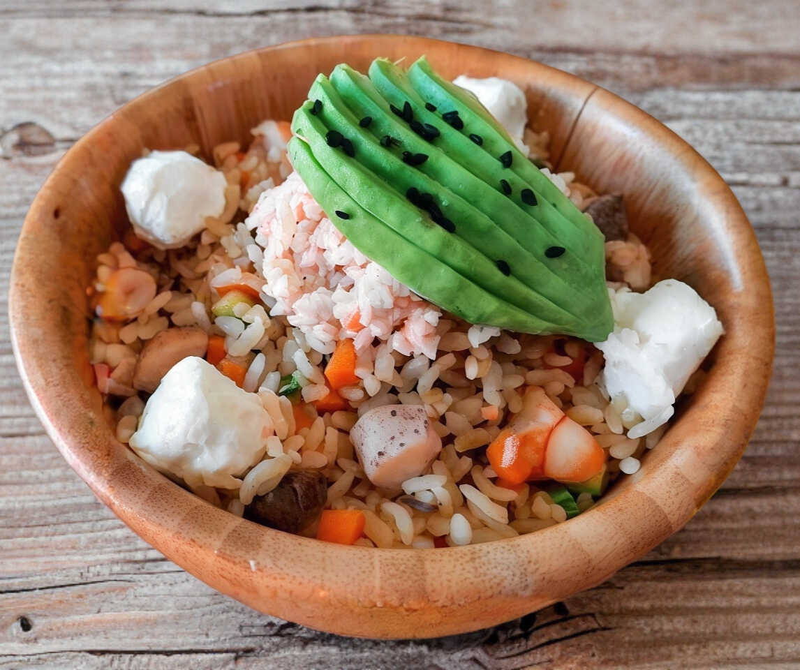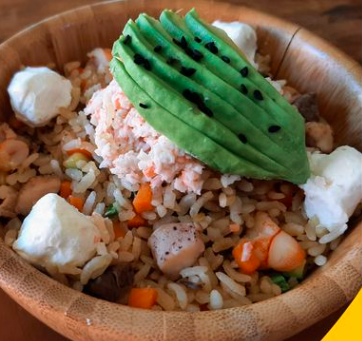 Arroz combinado con Camarón, Res, Pollo, Zanahoria, Calabaza, cebolla acompañado con ensalada tampico, Queso crema, Aguacate y Ajonjolí.