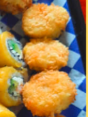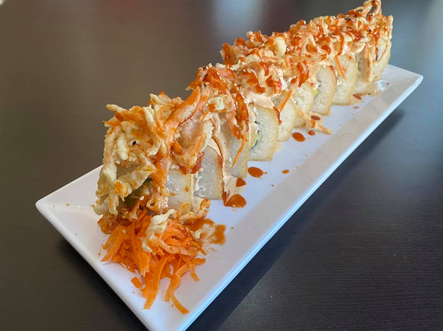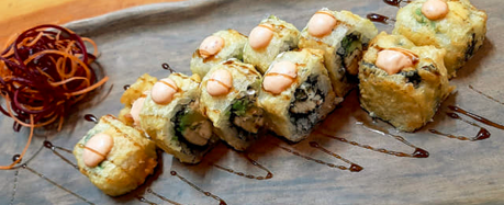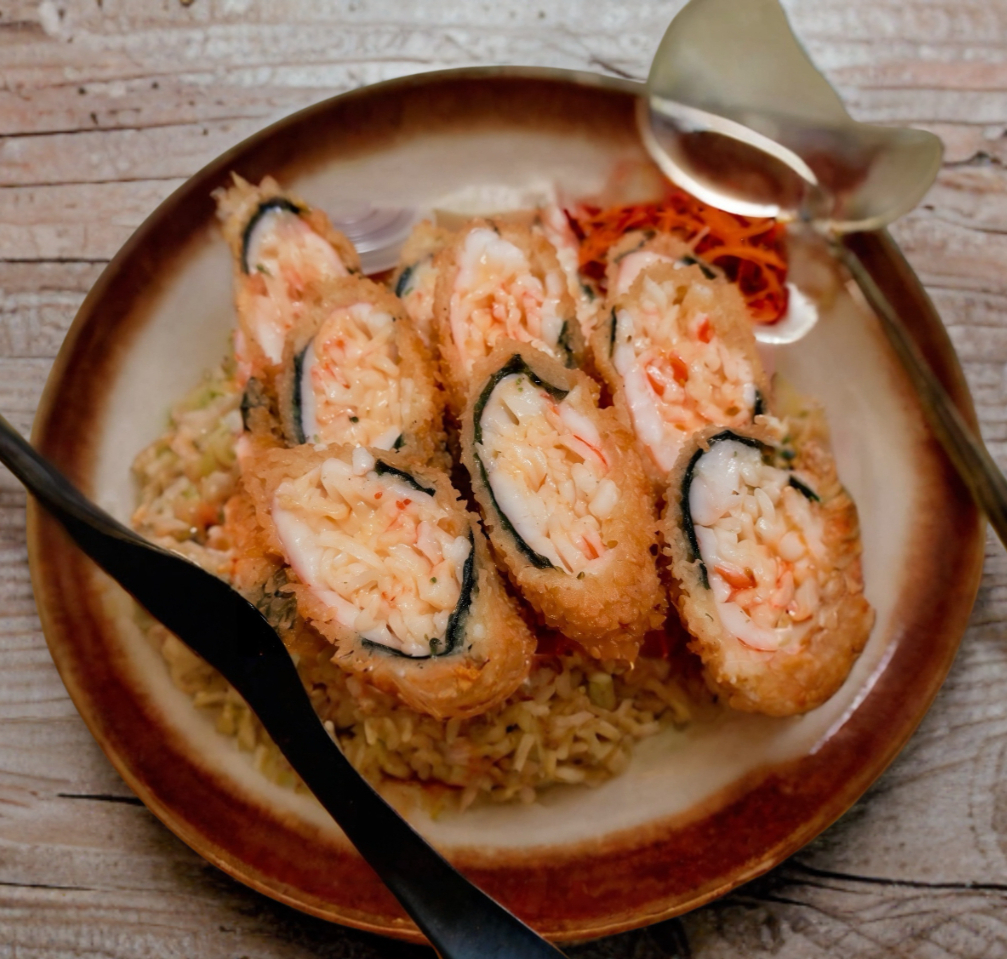 Roll empanizado relleno de Camarón, Carne, aguacate, queso crema, pepino, con topping de ensalada Tampico y Ajonjolí