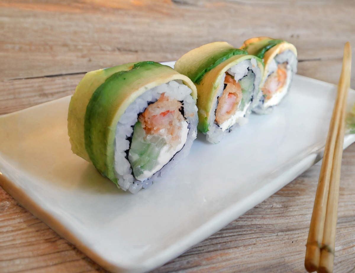 Relleno de Camarón empanizado, Queso crema, pepino, cubierto con láminas de aguacate y ajonjolí