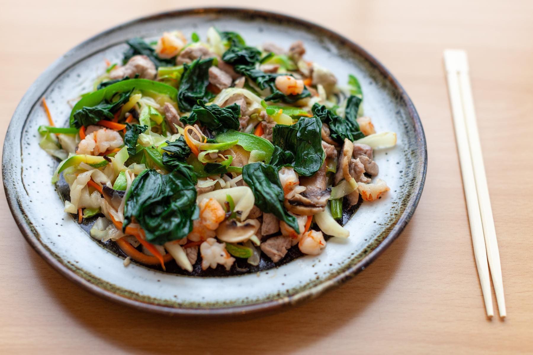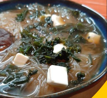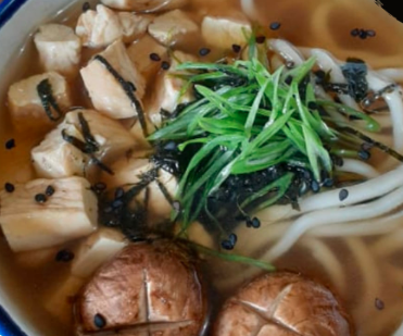 Pasta Udon, Shitake, Pollo, alga, cebollin y un toque de aceite de ajonjolí
