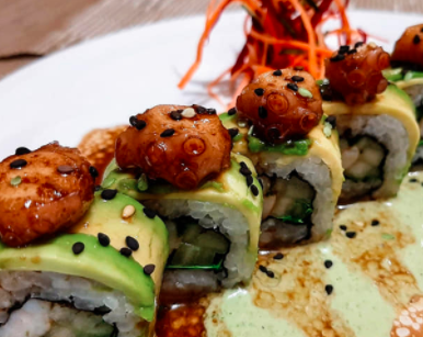 Por dentro; aguacate, pepino, Camarón, cebollin, cubierto de aguacate y rodajas de Pulpo marinadas