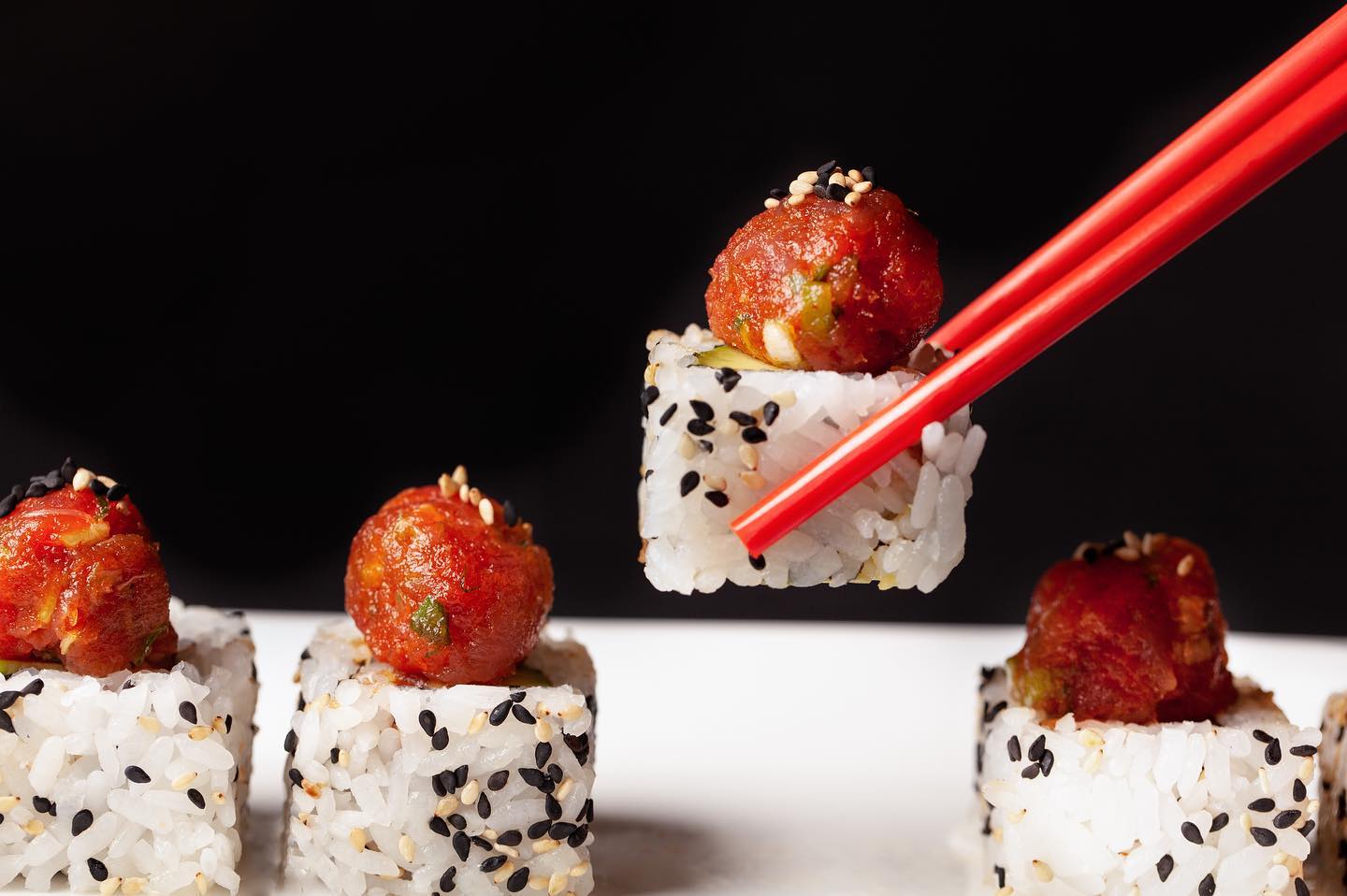 Roll relleno de Surimi, Aguacate, pepino, cubierto con Spicy tuna y ajonjolí