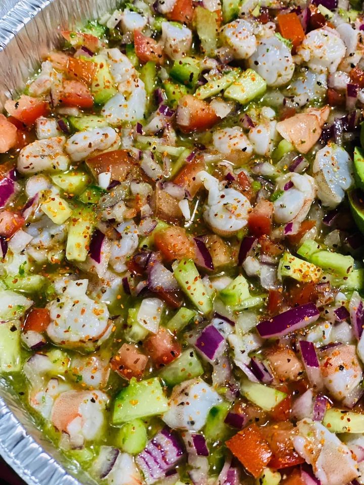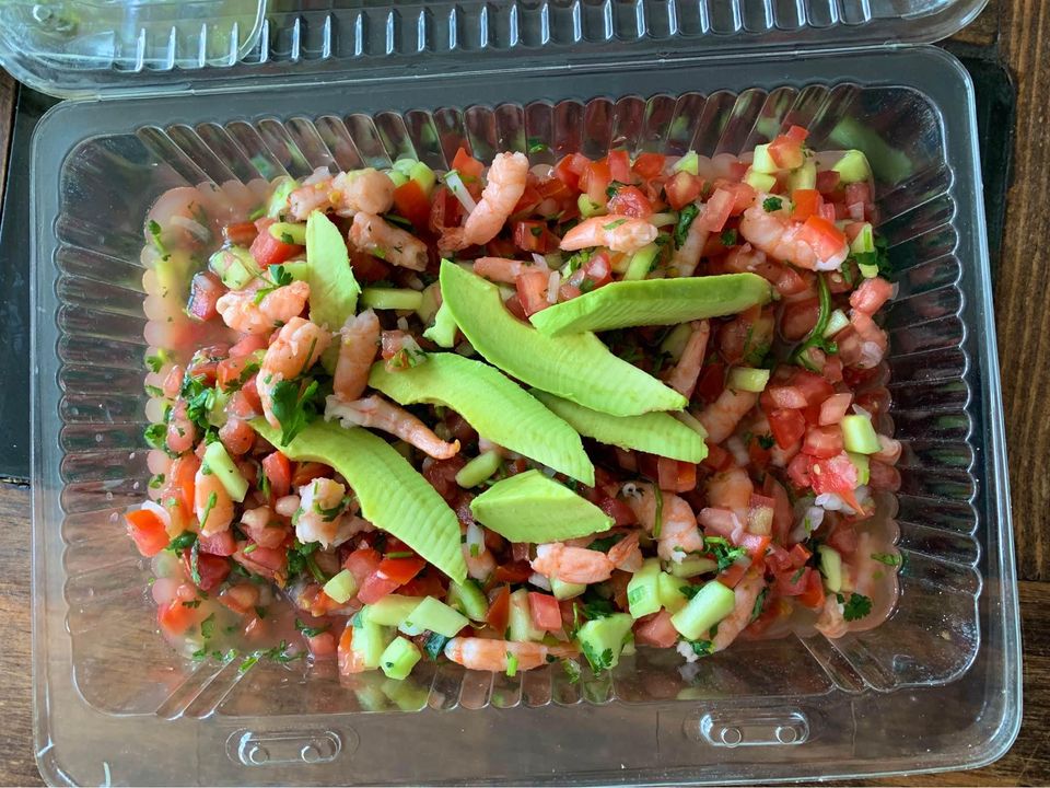 Arroz combinado con Camarón, Zanahoria, Calabaza, cebolla acompañado con ensalada tampico, Queso crema, Aguacate y Ajonjolí.