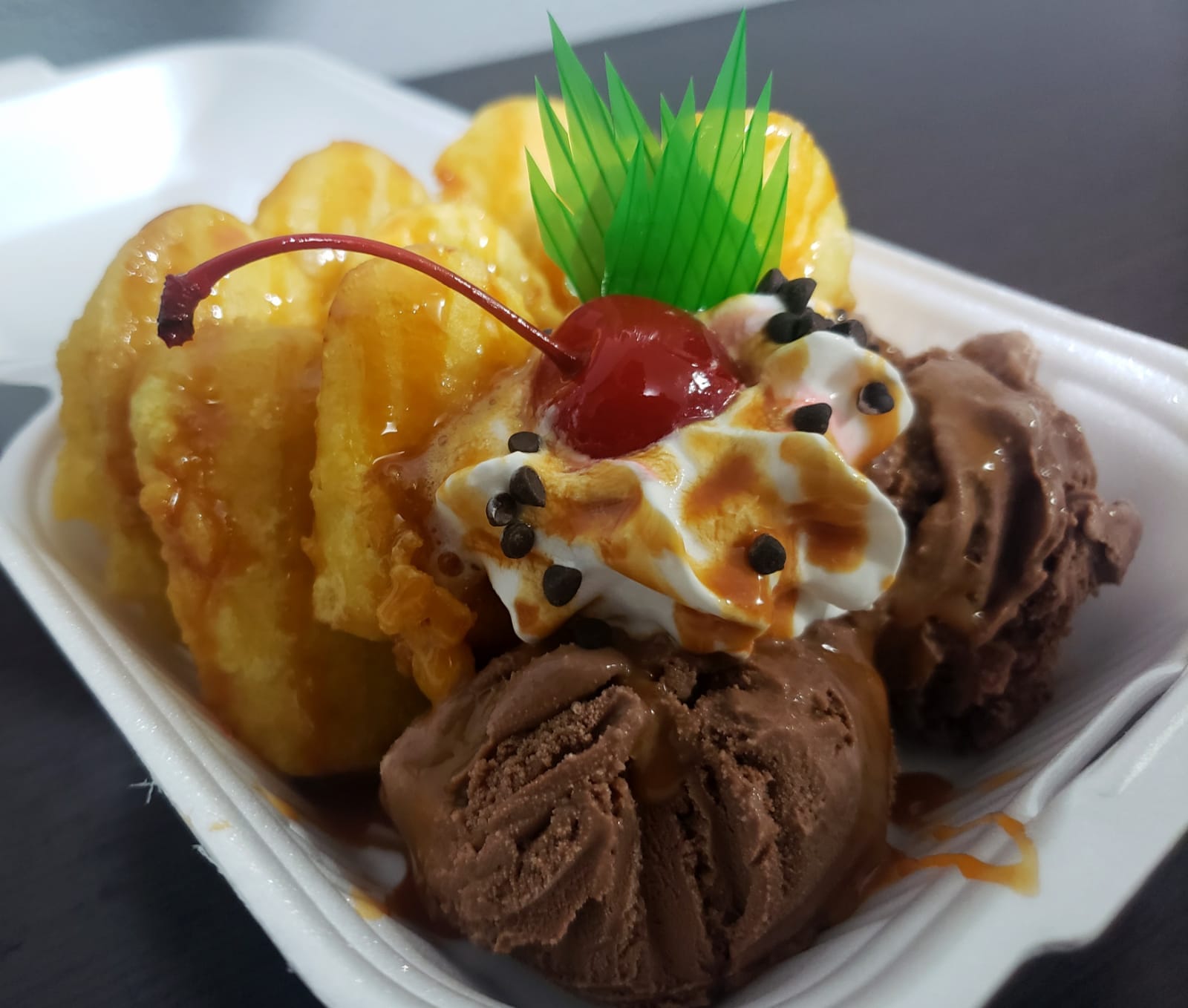 Roll empanizado relleno de Camarón, Aguacate, plátano frito, cubierto de philadelphia