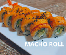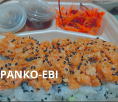 10 piezas de Relleno de Camarón tempura, Aguacate, Queso crema, pepino, cubierto con láminas de plátano frito, ajonjolí y acompañado con salsa de mango