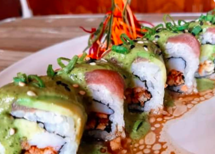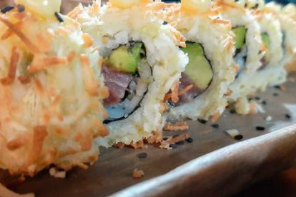 Cubierto de Tempura con coco, relleno de spicy tuna, aguacate, ajonjolí, acompañado con salsa de mango