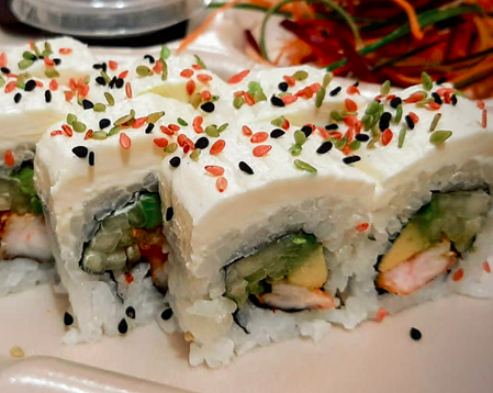 Roll relleno de Aguacate, Pepino, Cangrejo cubierto con Queso crema y ajonjolí