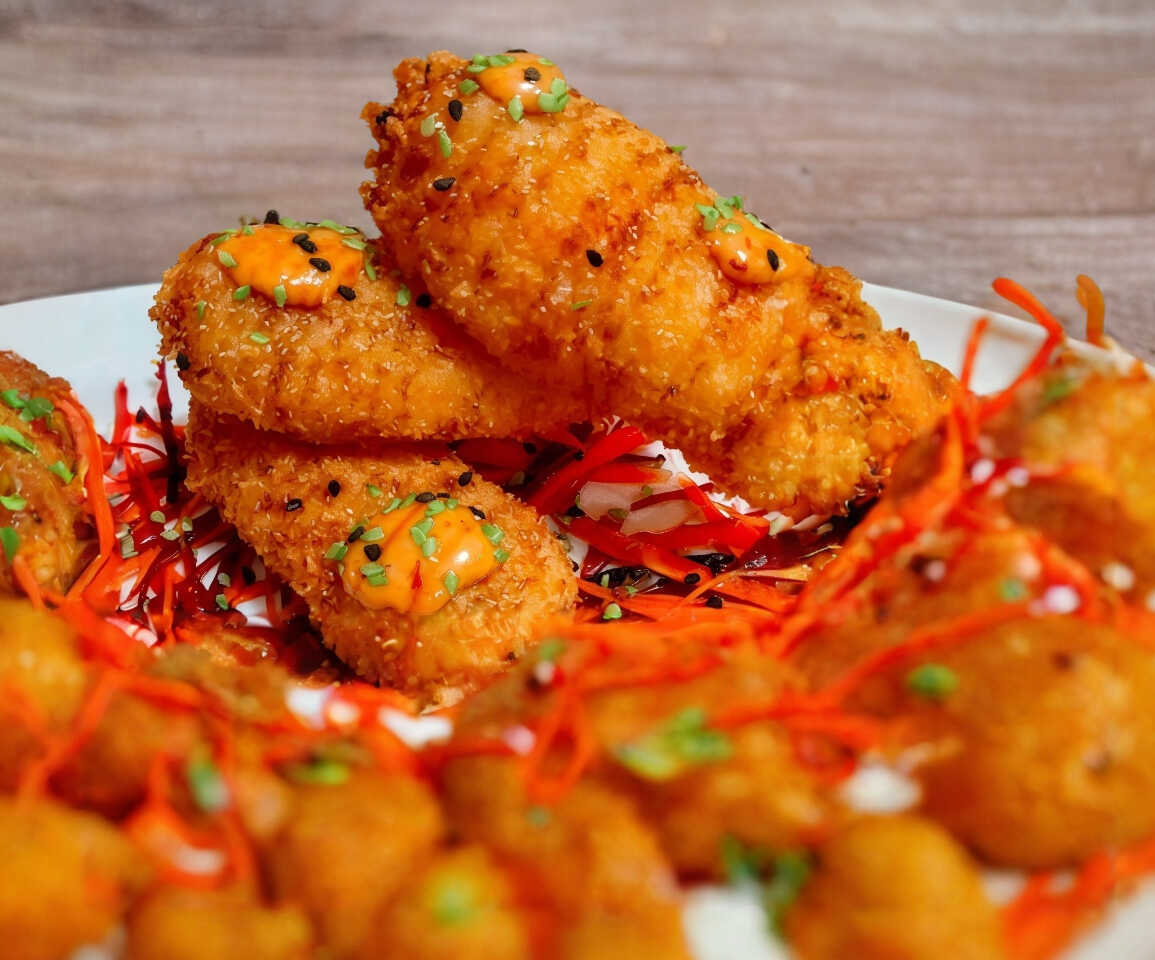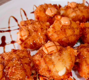Camarón Empanizado relleno con spicy de Cangrejo especial, acompañado con salsa de naranja y salsa serranito