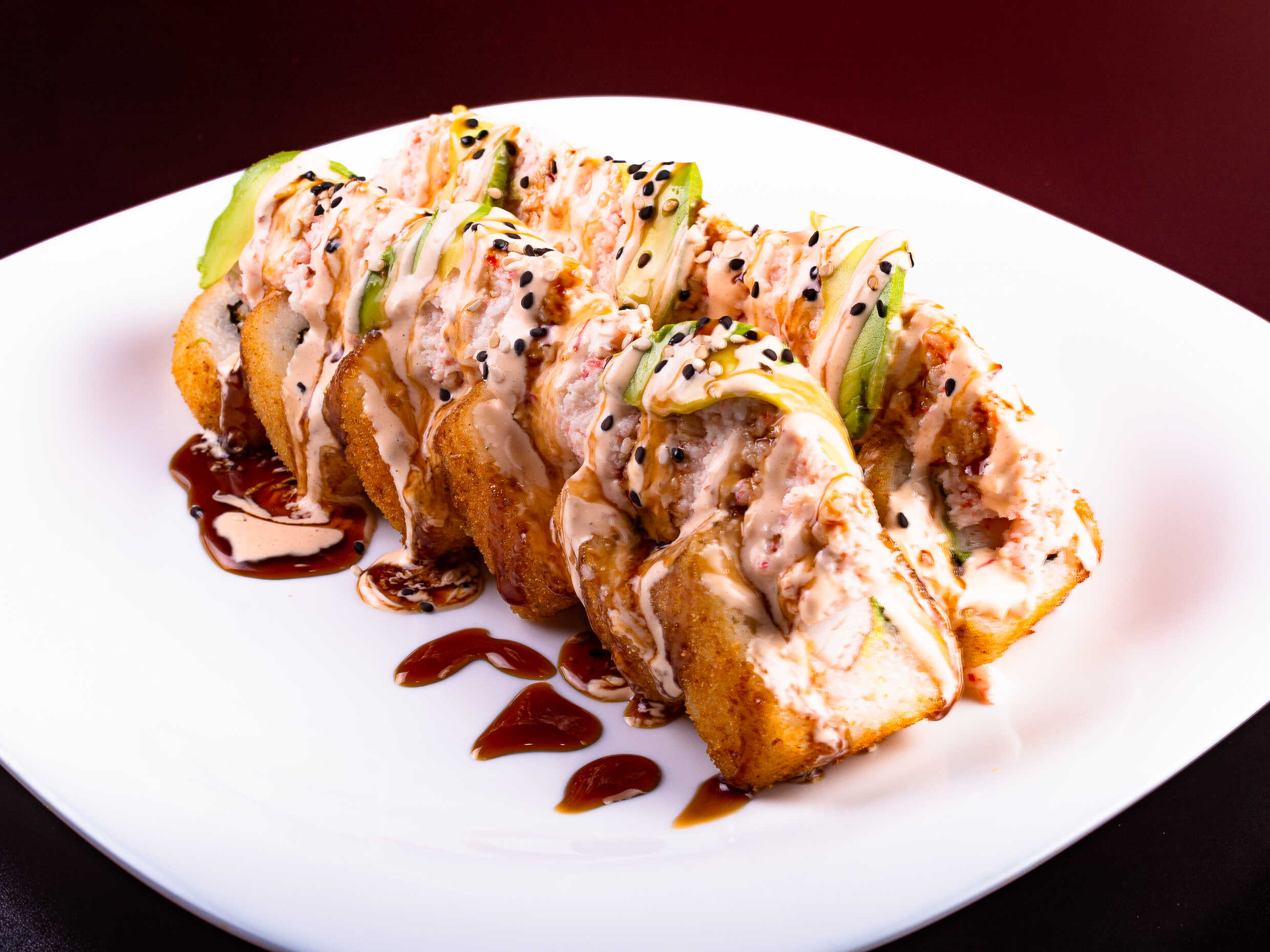 Queso crema, aguacate y camarón empanizado, mitad natural y mitad empanizado, bañado en aderezo togarashi.