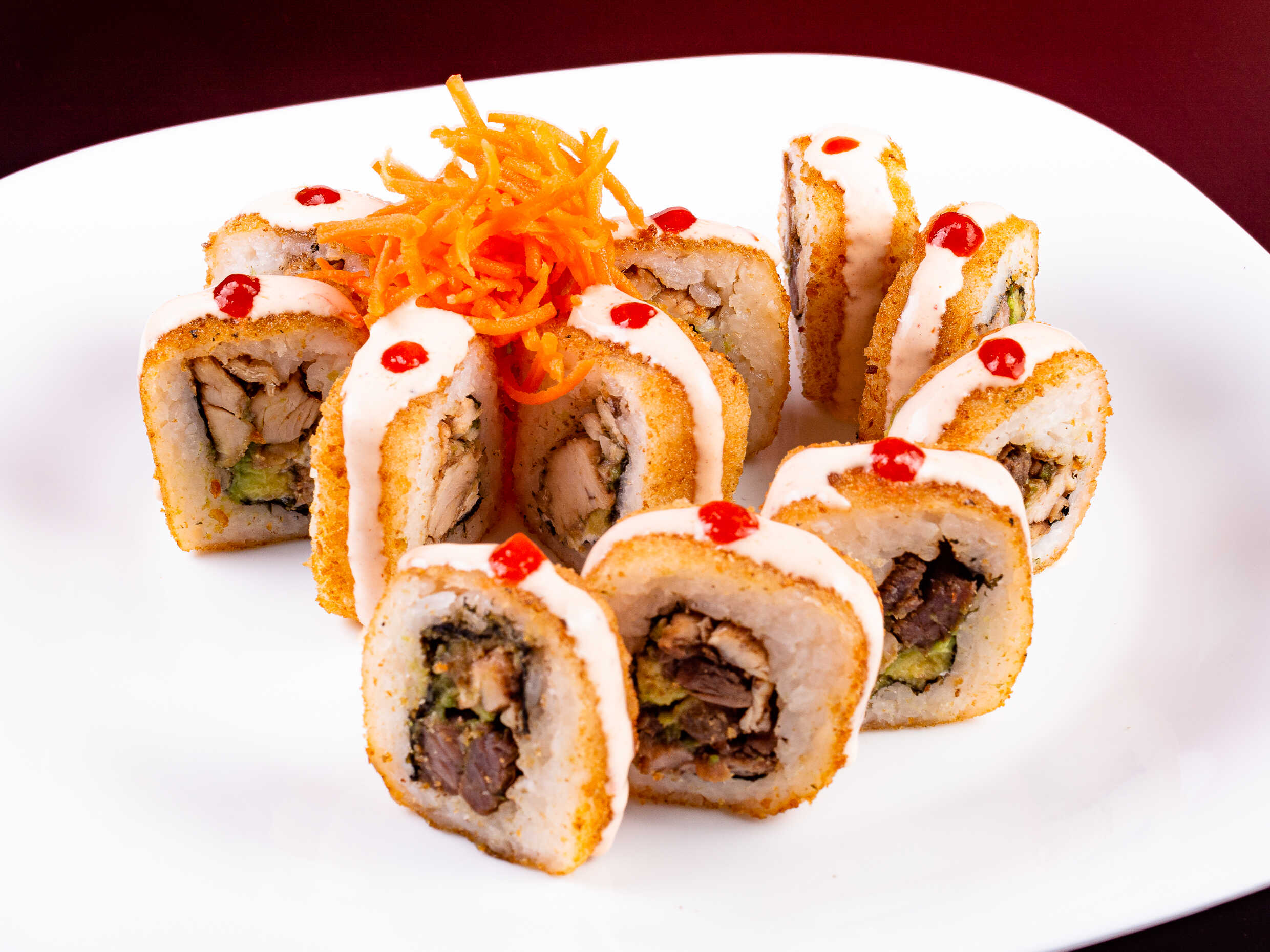 Aguacate, pollo, res, bañado en aderezo con un toque de salsa sriracha.