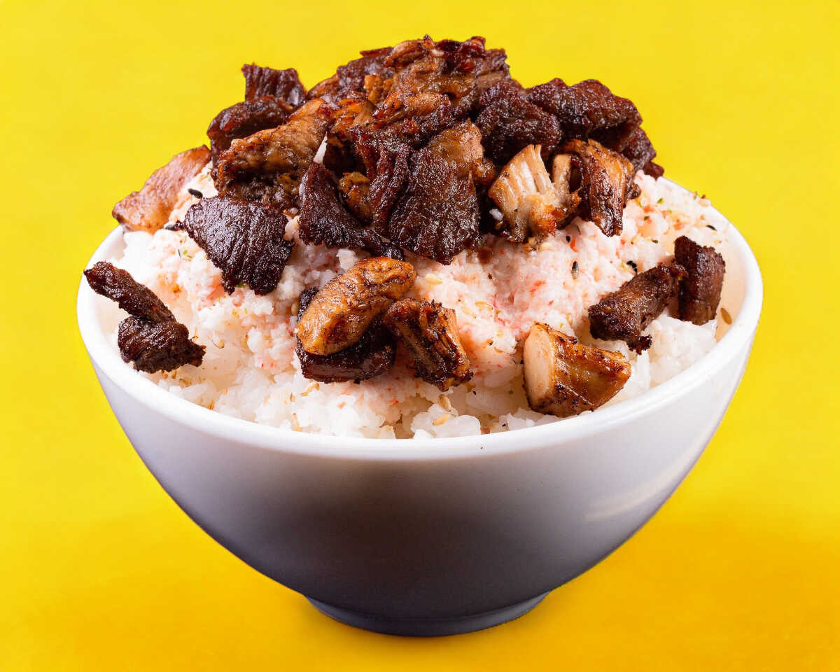 Arroz al vapor bañado en salsa teriyaki, encima tampico.