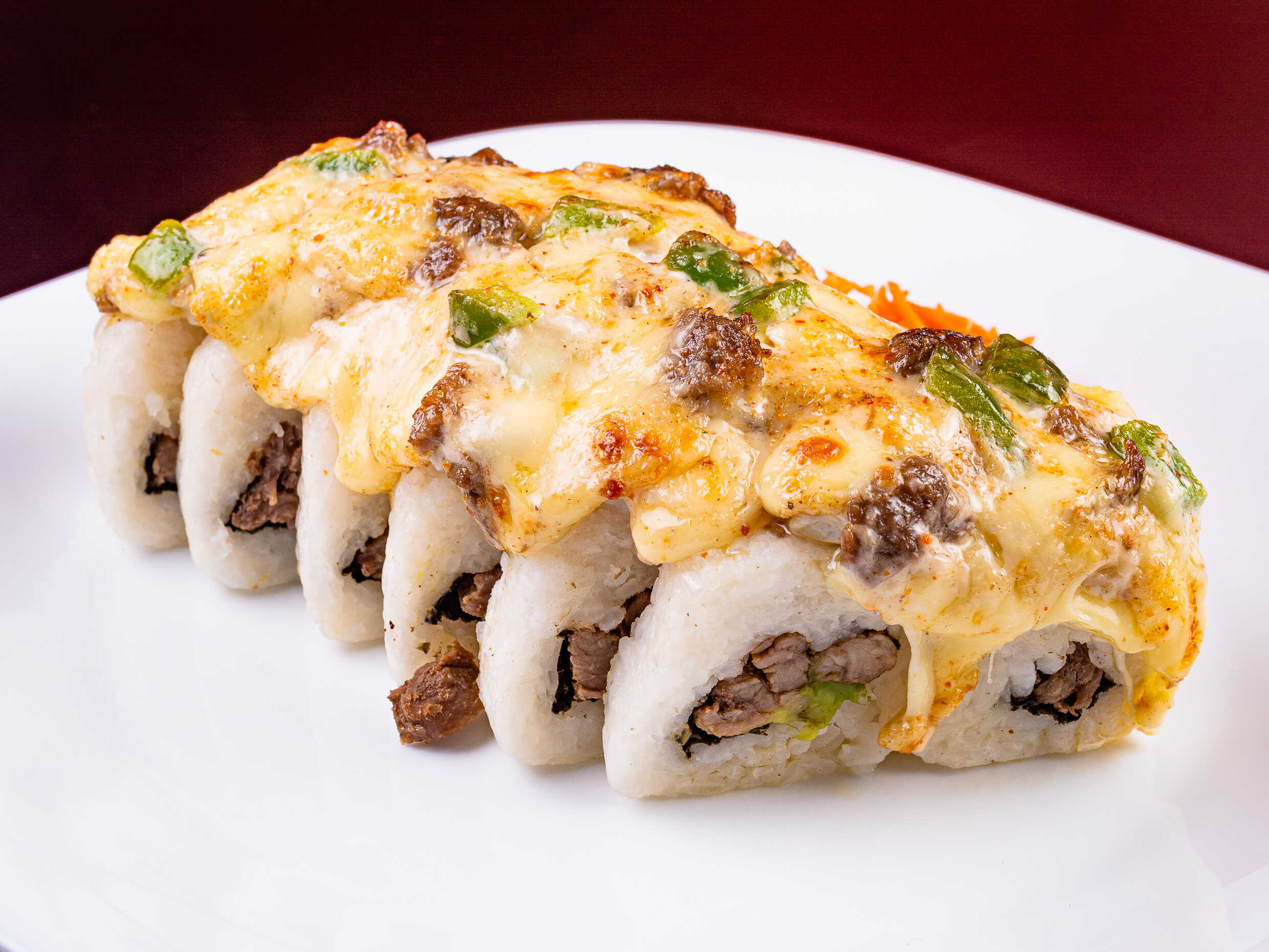 Queso amarillo, aguacate, cangrejo, encima topping de salmón.