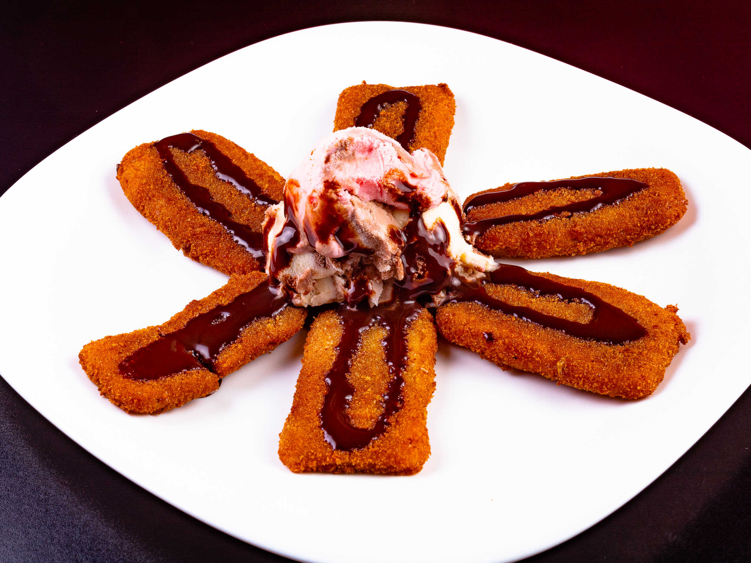 Tiras de plátano empanizado, acompañado con helado, bañado en chocolate o cajeta.