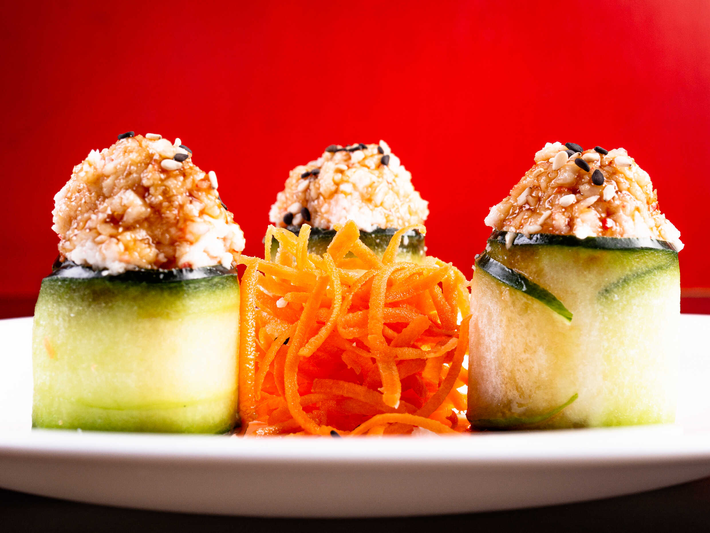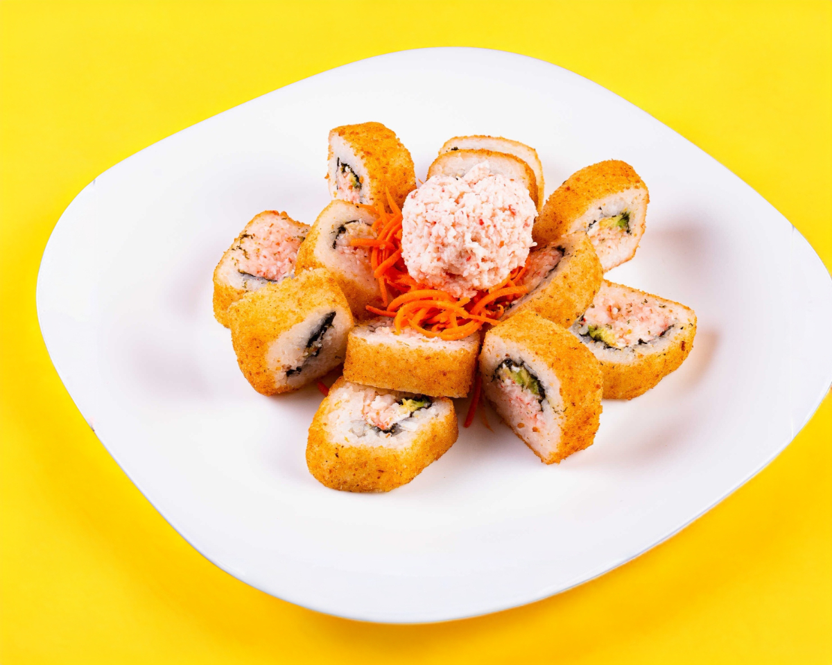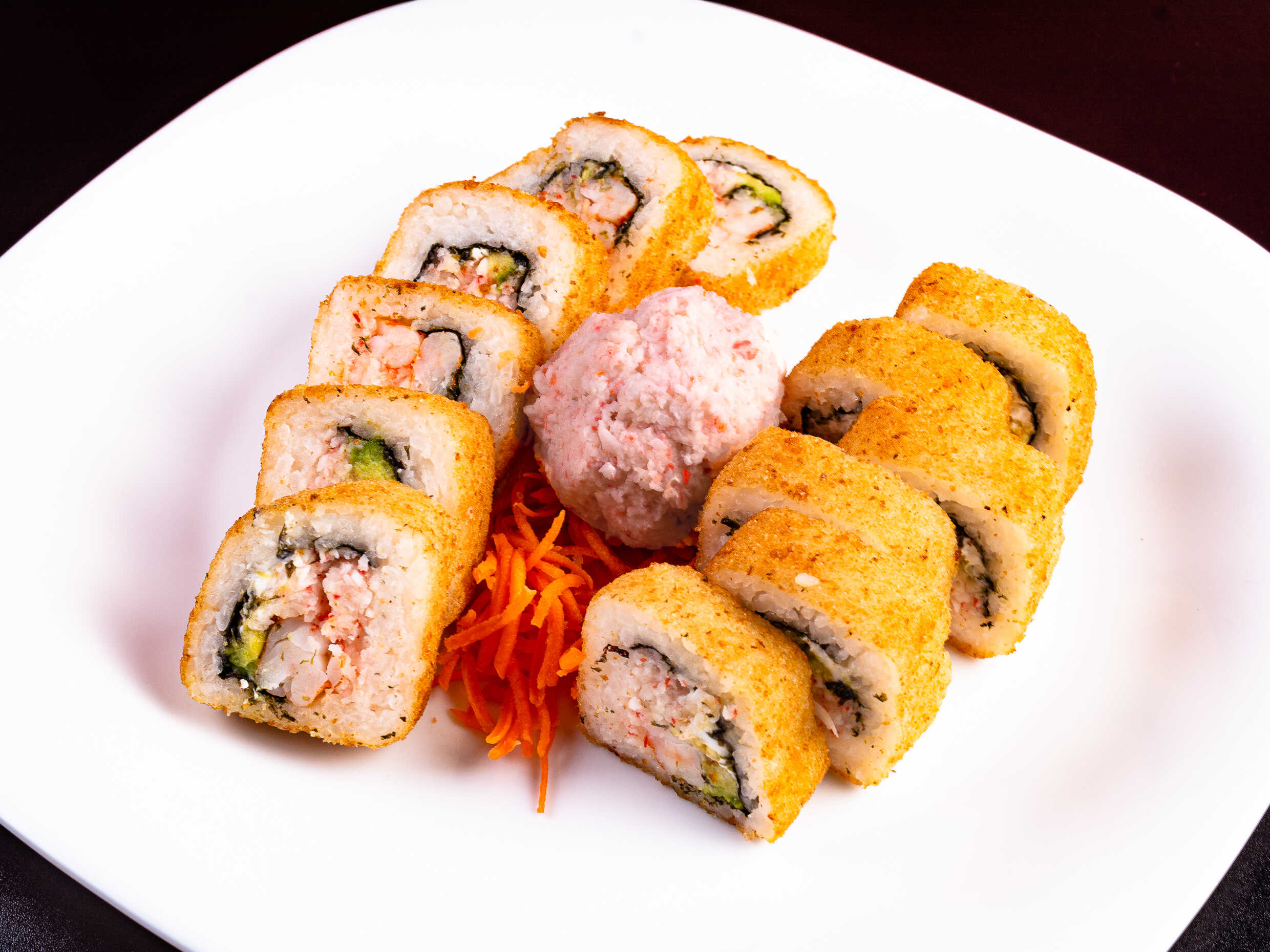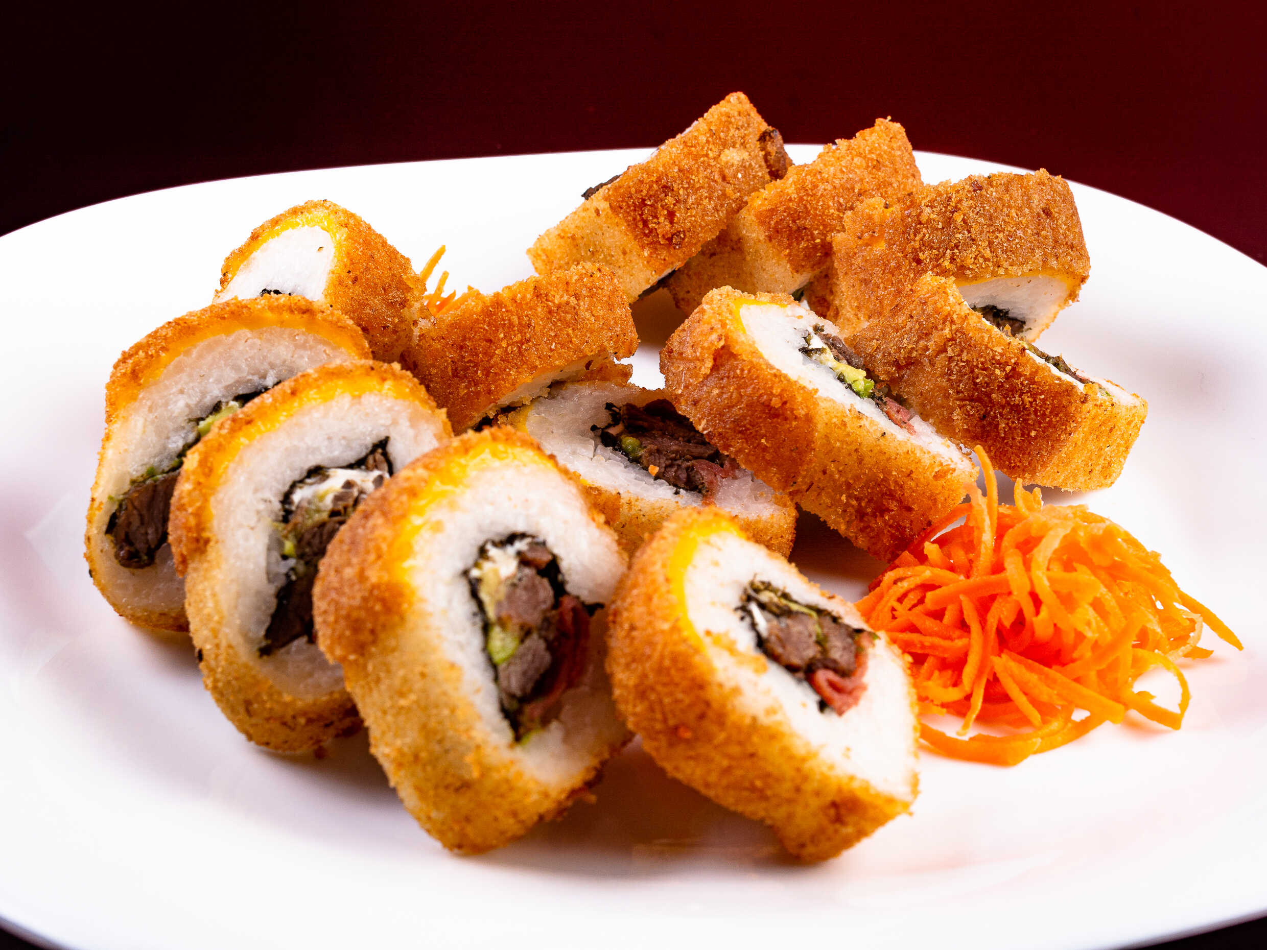 Aguacate, pepino, cangrejo empanizado, por fuera queso crema y camarón.