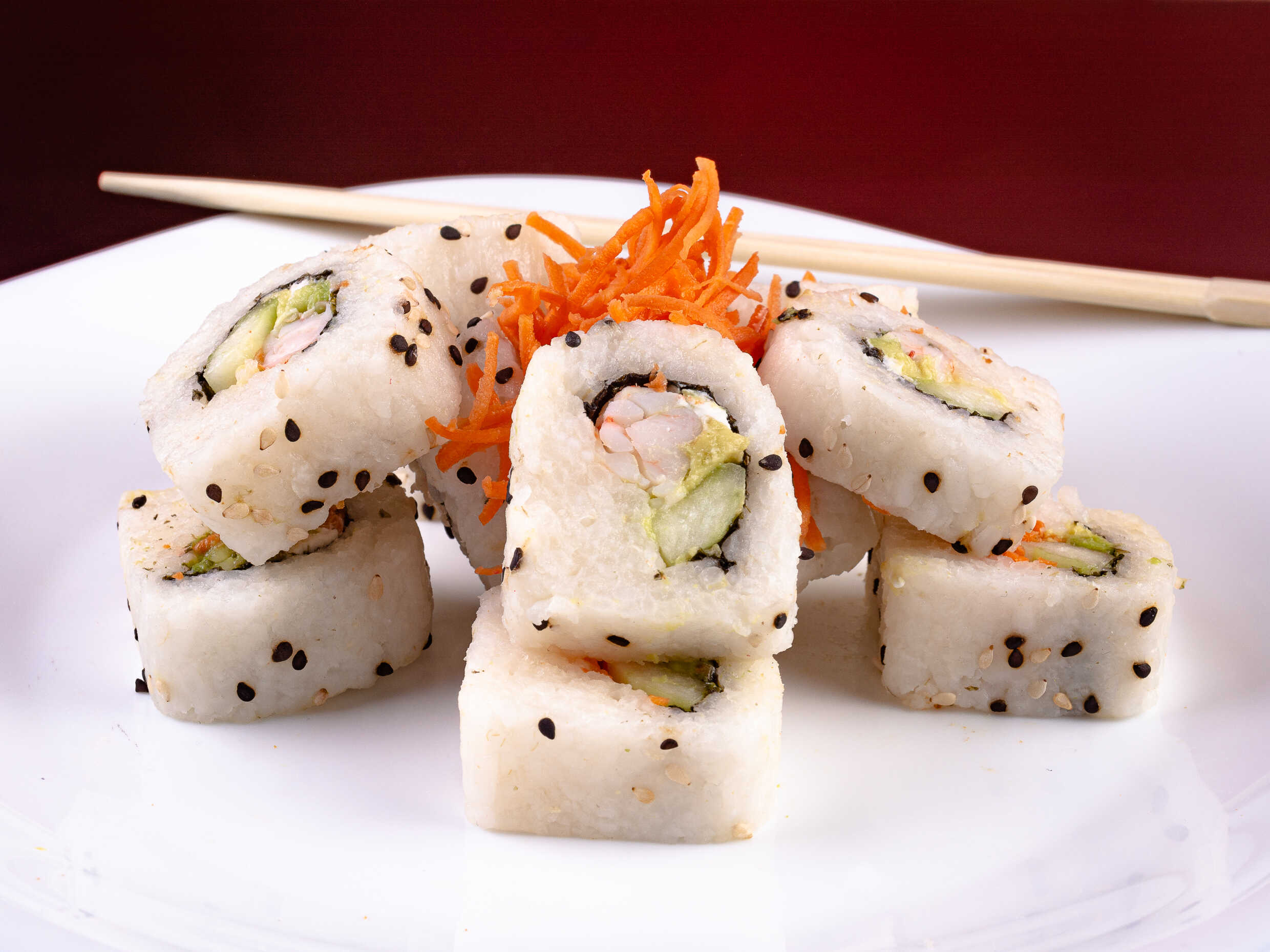 Aguacate, zanahoria, camarón, por fuera queso crema y ajonjolí.