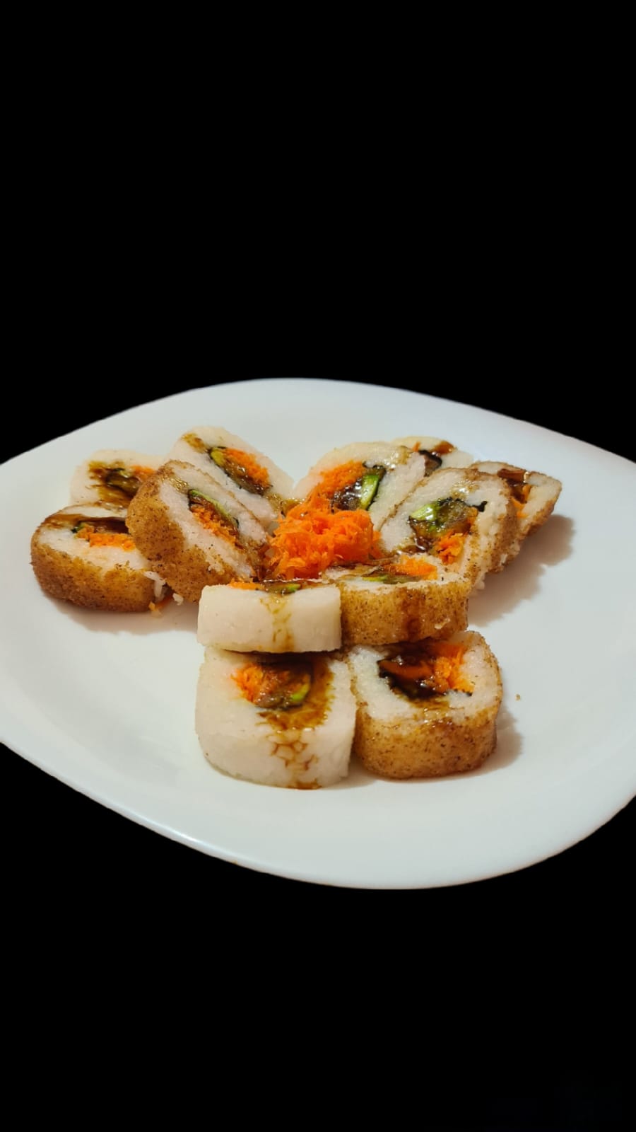 Tiras enrolladas rellenas de arroz, encima tampico, bañado en salsa de anguila.