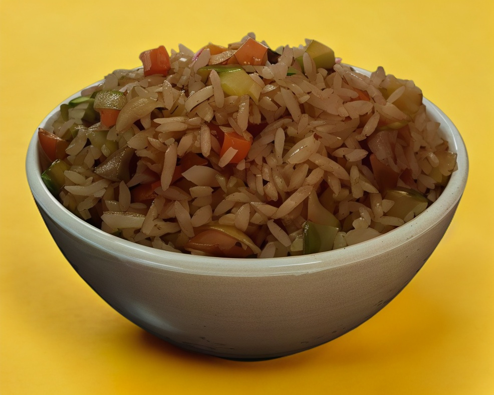 Arroz frito con calabaza, zanahoria, pollo y res.