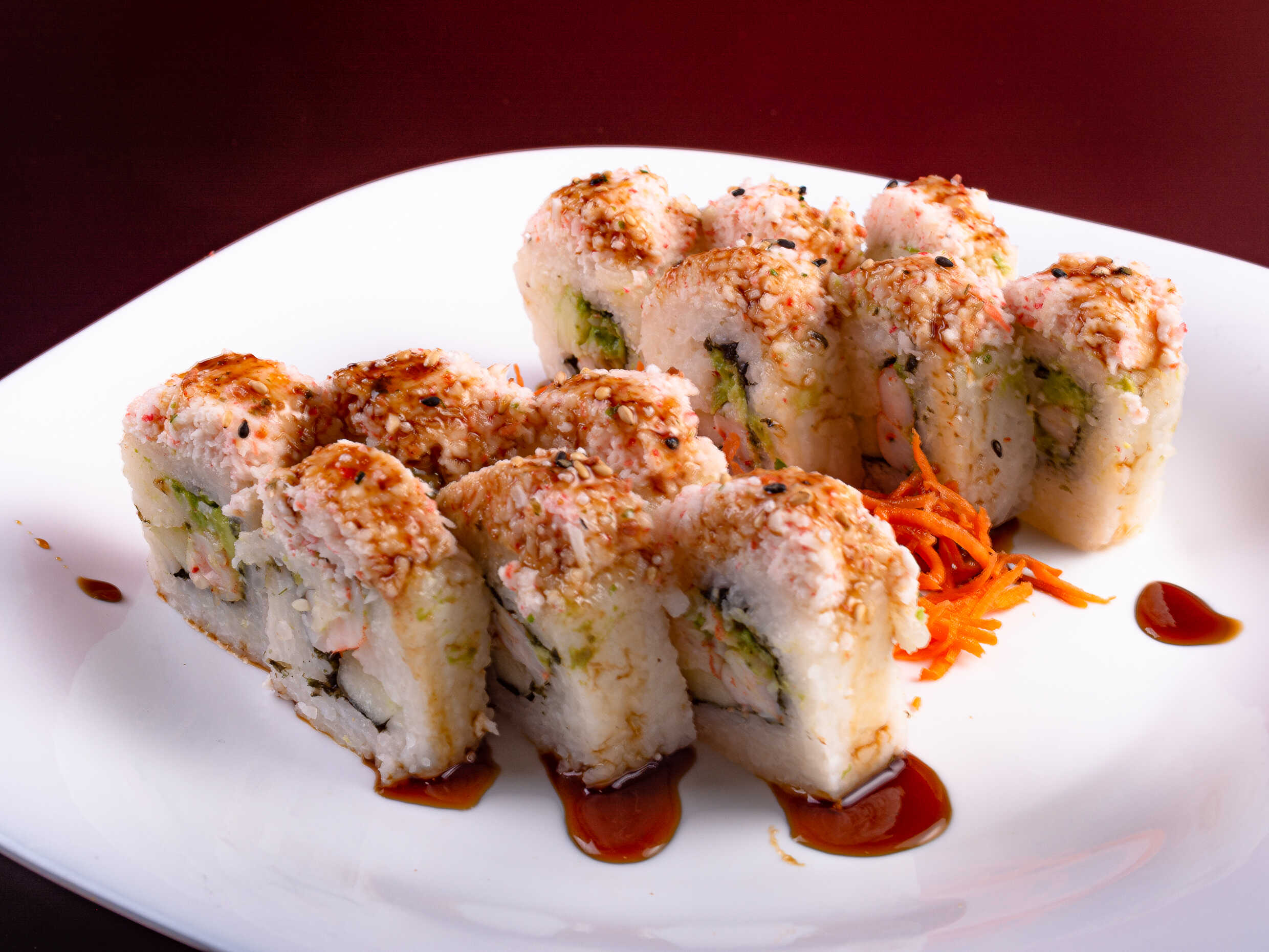 Aguacate, pepino y camarón, por fuera queso crema, tampico, Bañado en salsa de anguila.