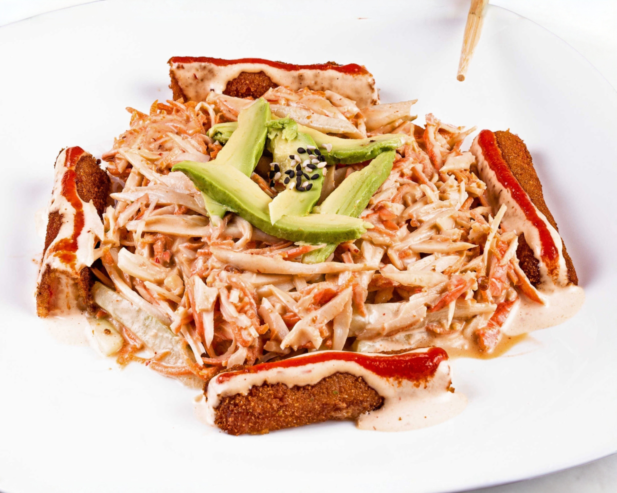 Cangrejo, aguacate, dip de la casa. por fuera dip de la casa con un toque de salsa sriracha.