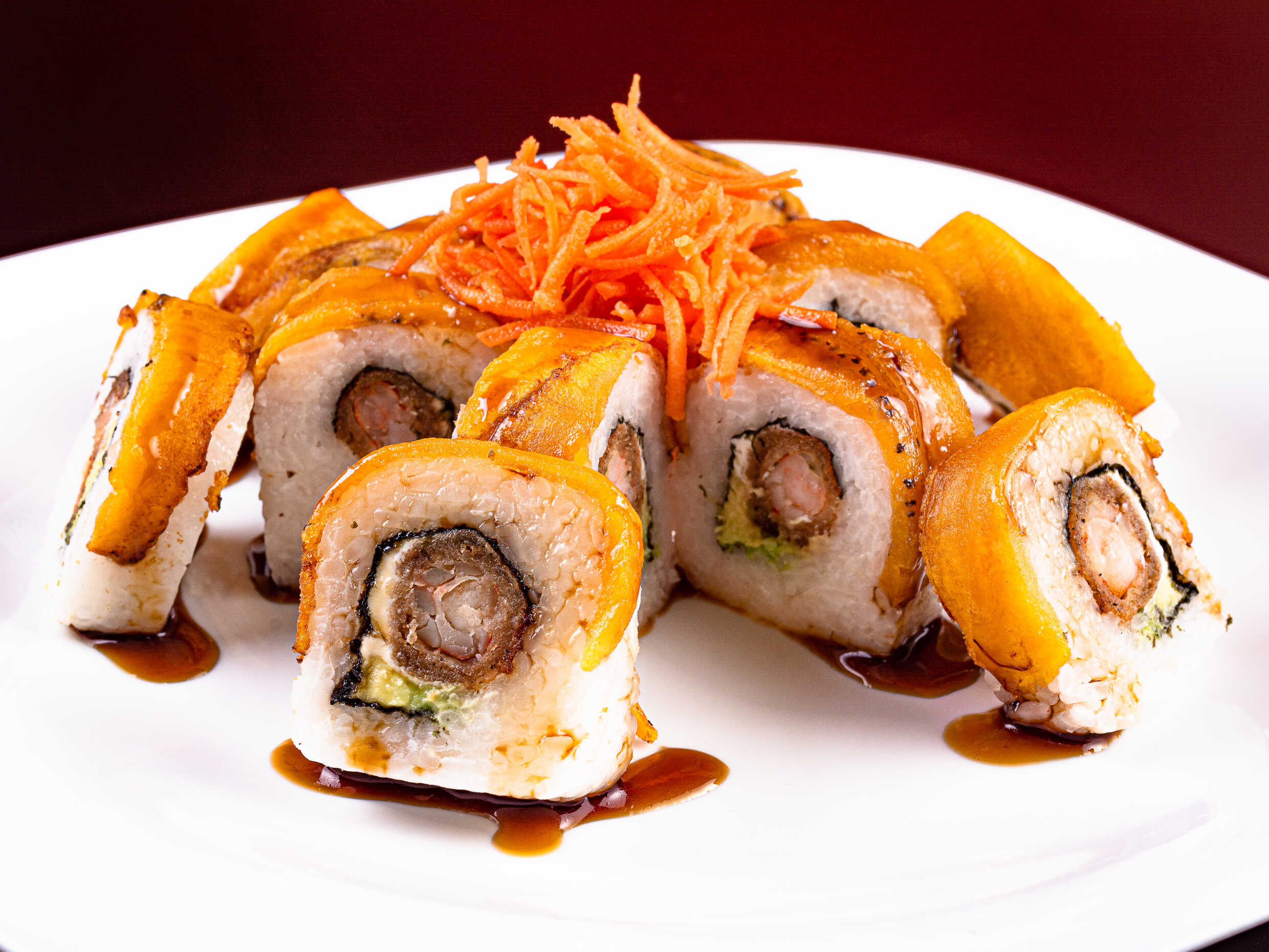 Queso crema, aguacate, camarón empanizado, por fuera plátano frito, bañado en salsa de anguila.
