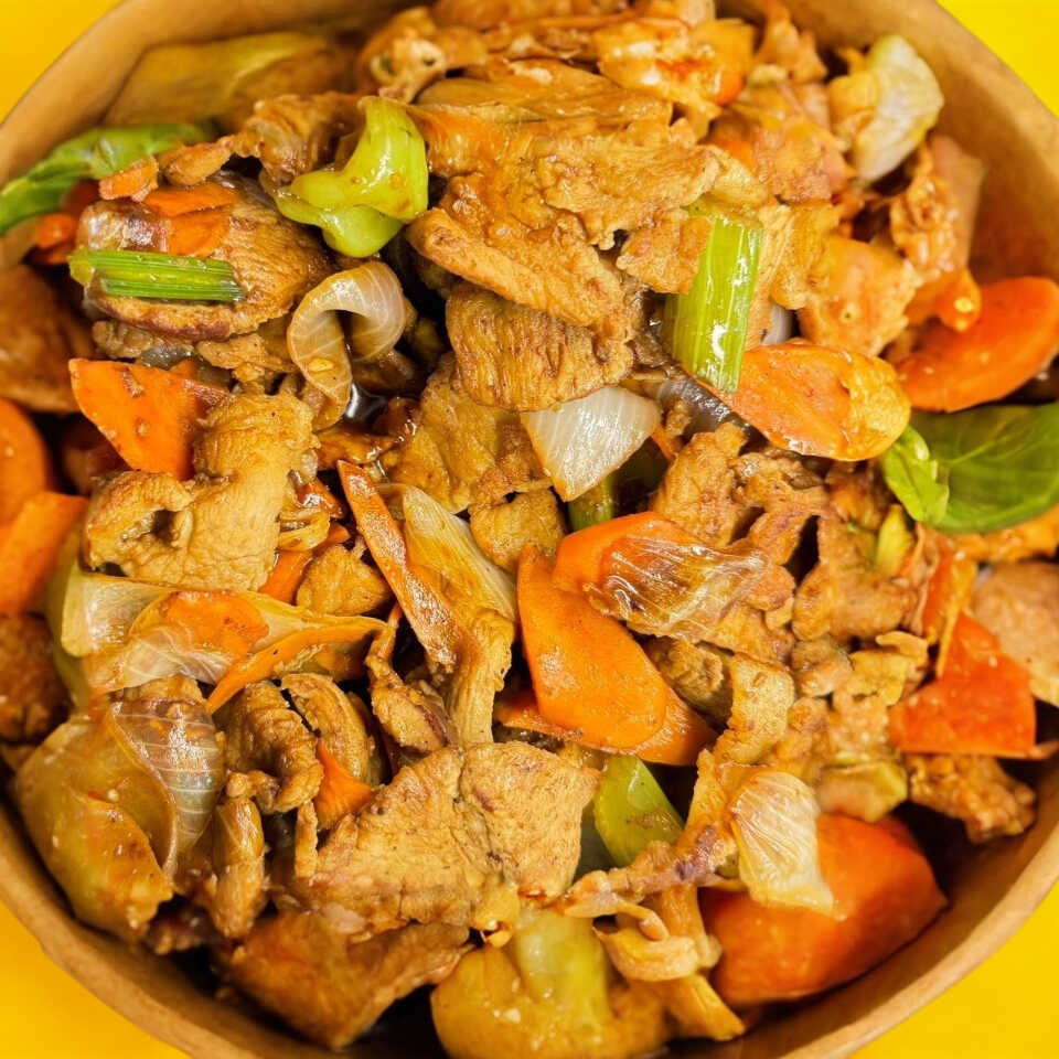 Pollo con brócoli frito.