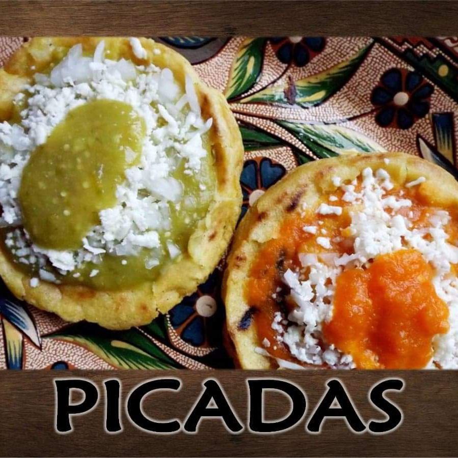 4 picaditas de masa de maíz, (opcional frijoles) salsa roja ó verde, crema, queso y cebolla.