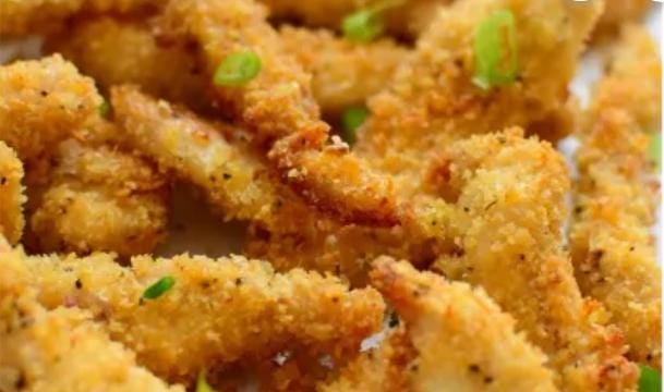 Crujientes fajitas de pechuga de pollo sazonadas y empanizadas con panko.
