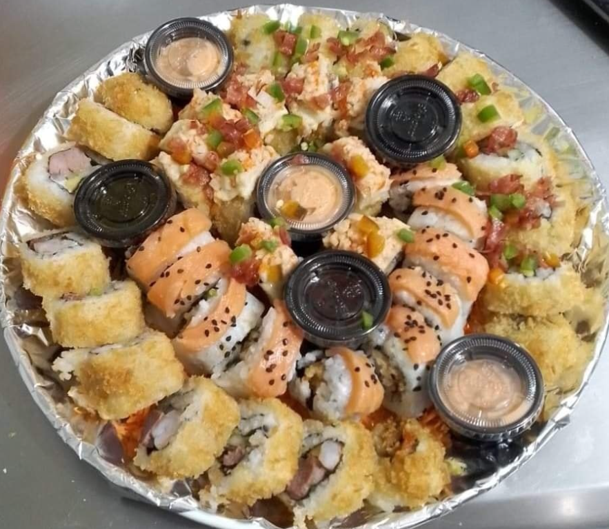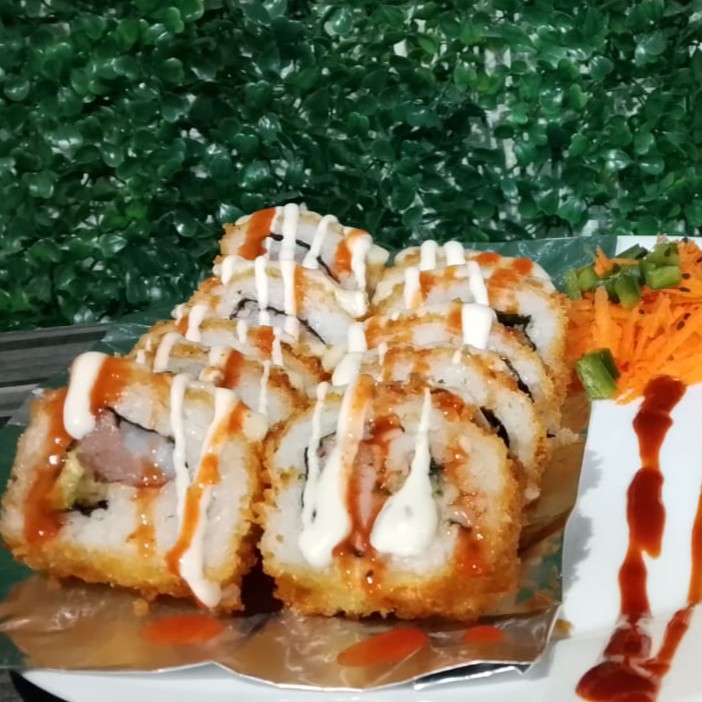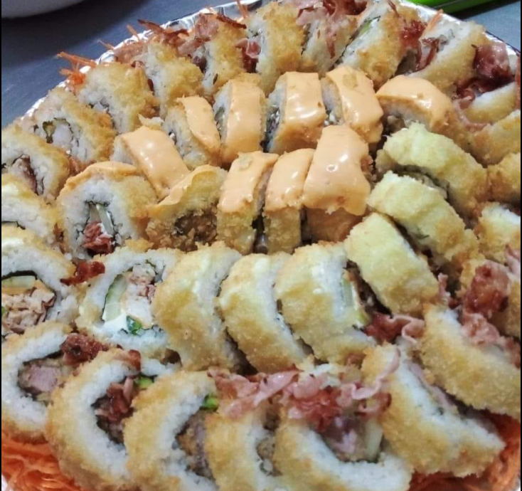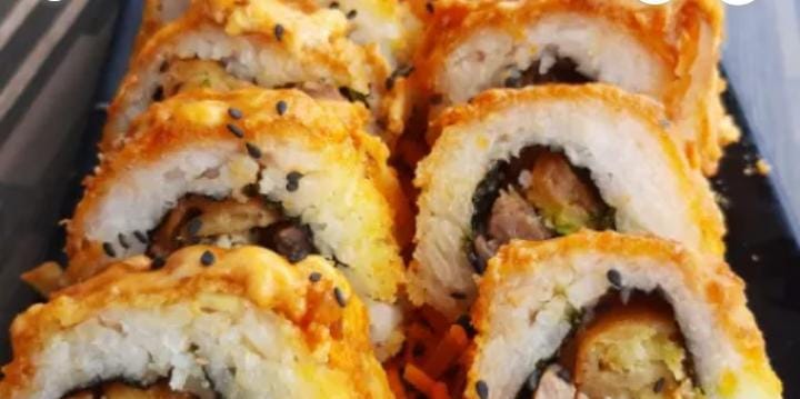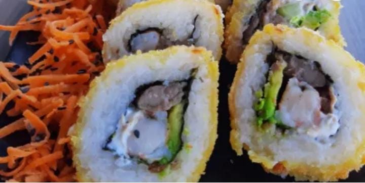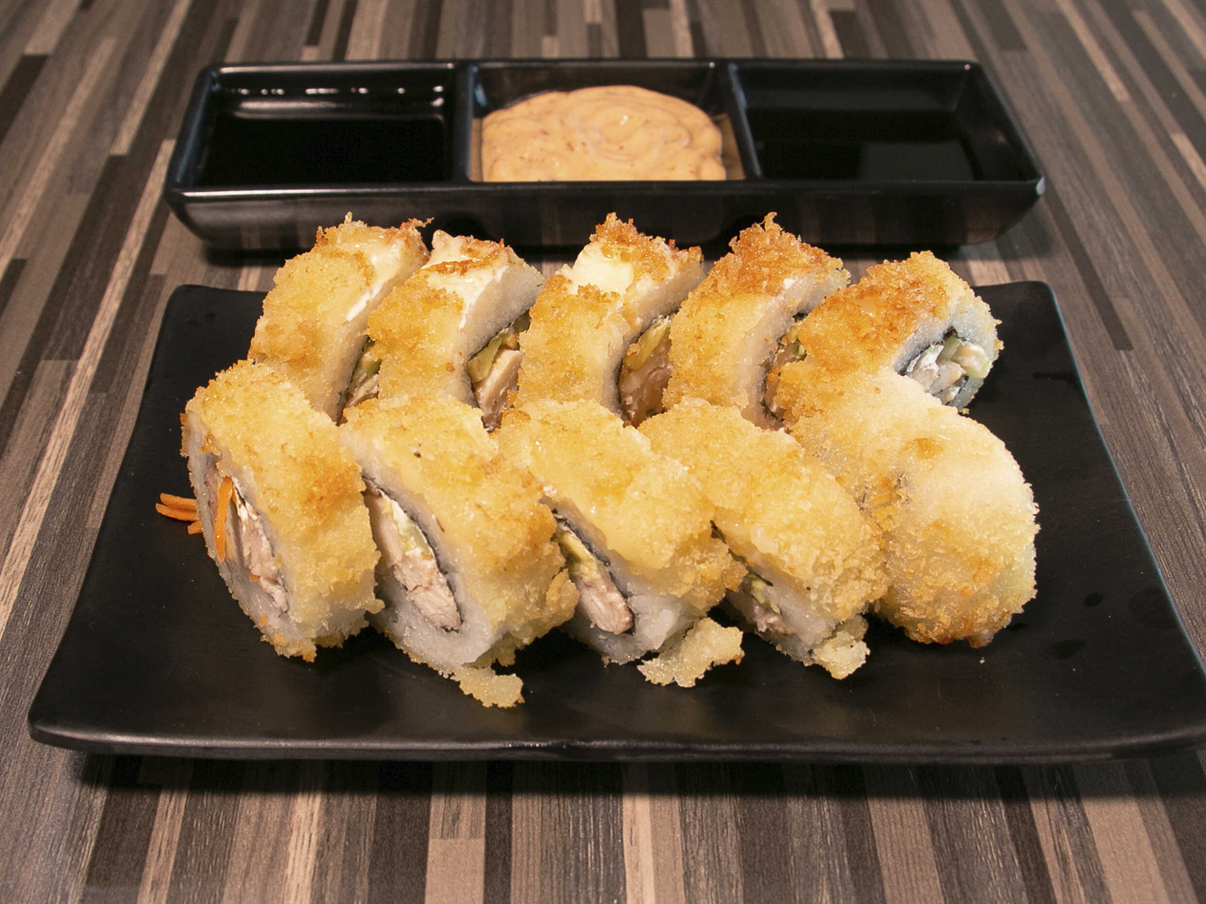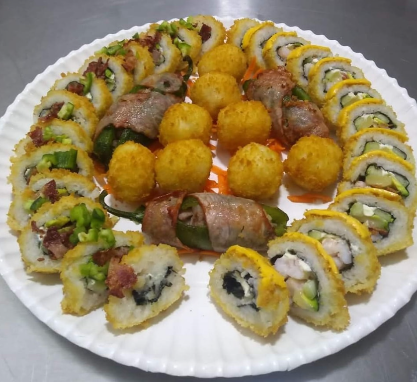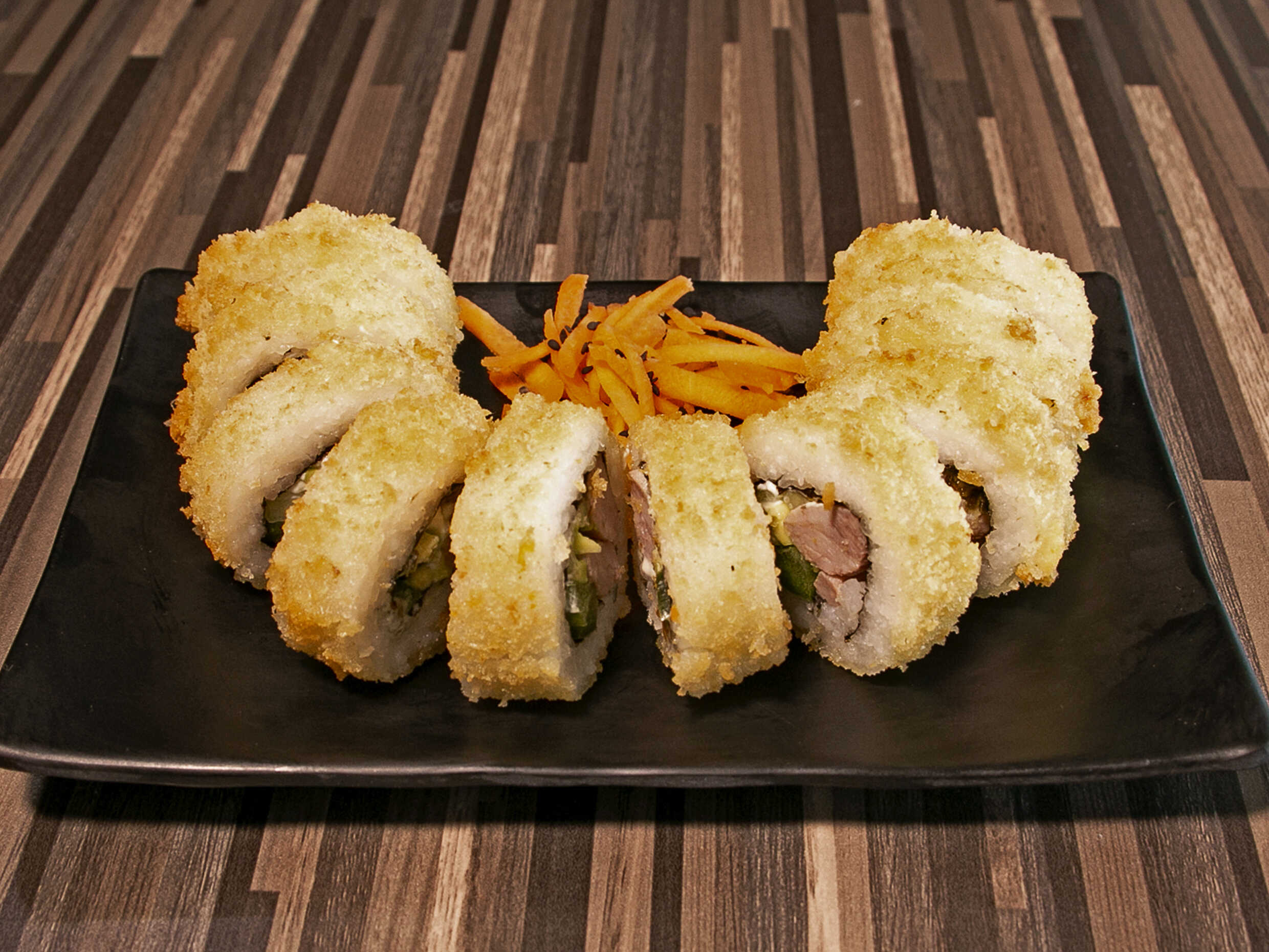 Relleno con pechuga de pollo, arrachera, empanizado por fuera, 10 piezas de sushi.