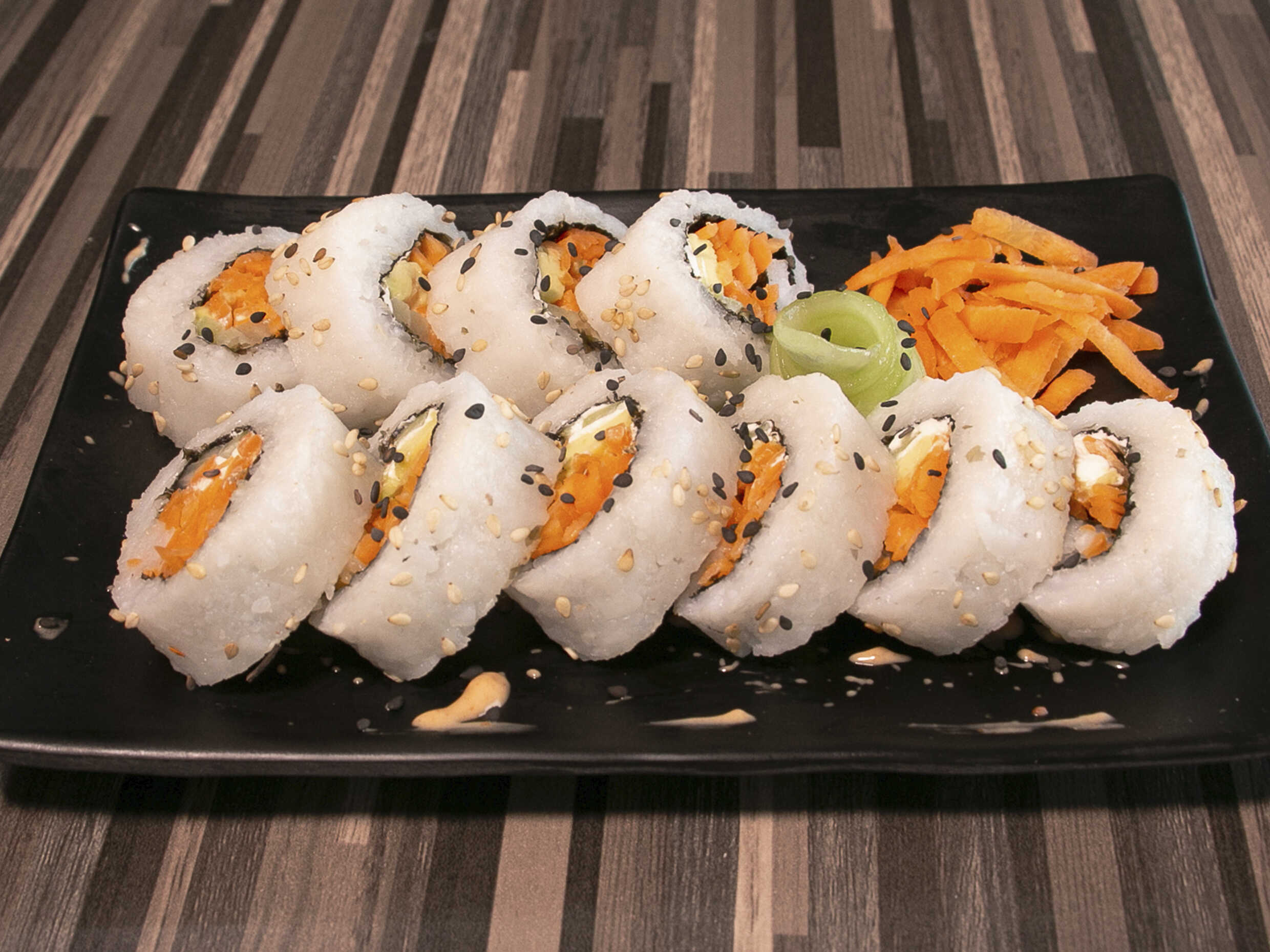 El vegetariano de la casa, relleno de queso philadelphia, aguacate, zanahoria y pepino, por fuera ajonjolí blanco.