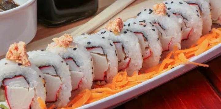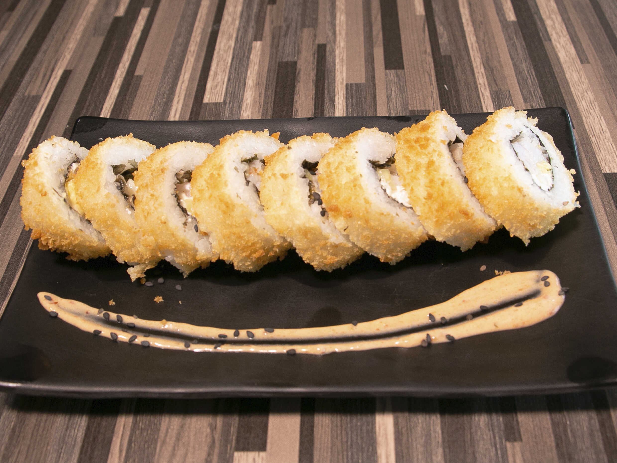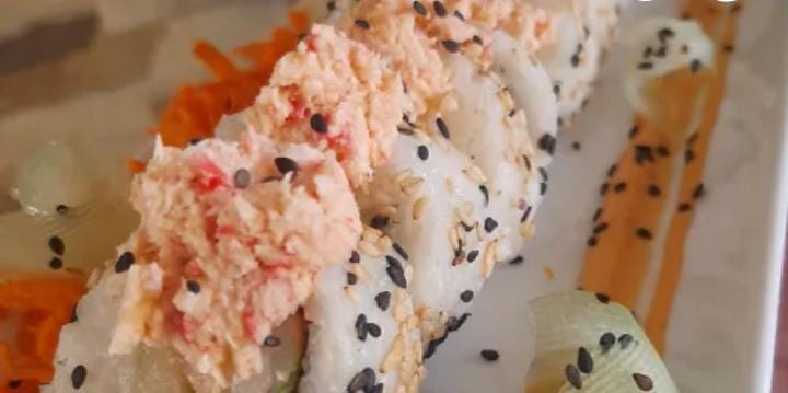 Con rico cangrejo por dentro, acompañado de ajonjolí negro y tampico por fuera, coronado de serrano rebanado.