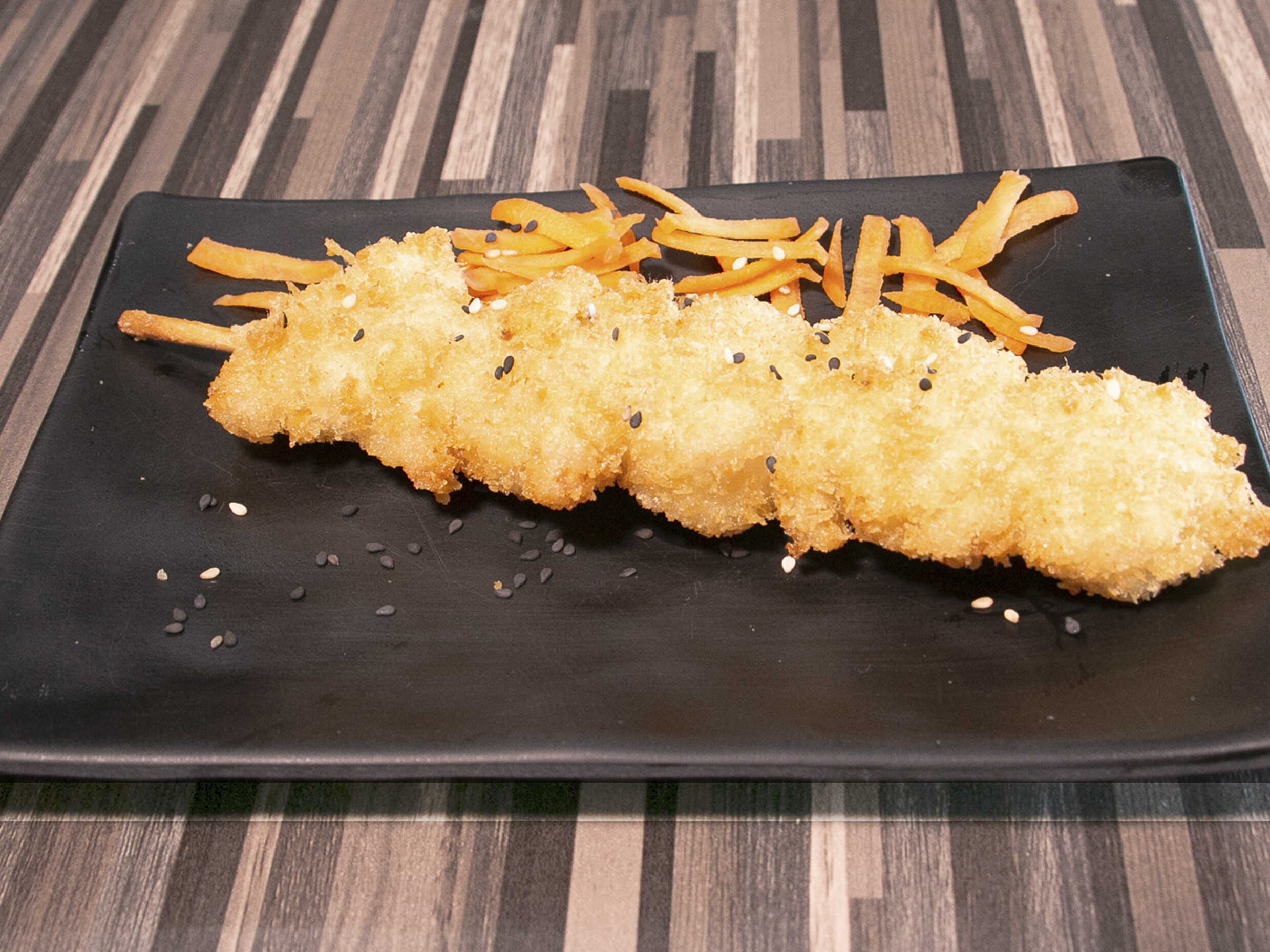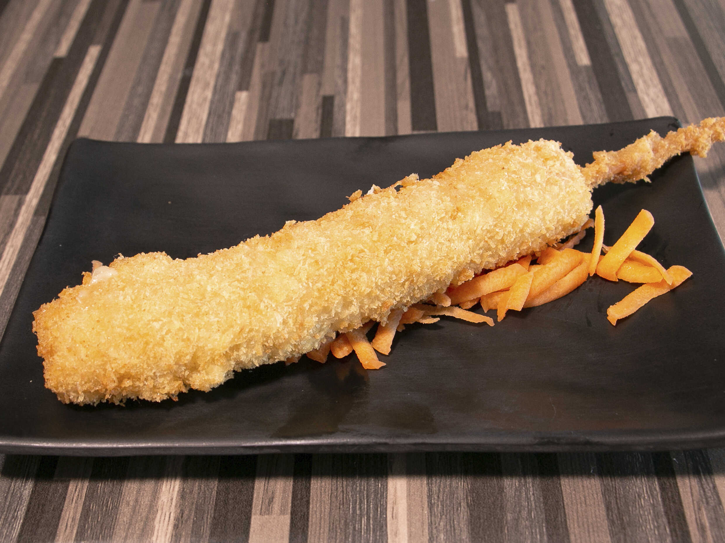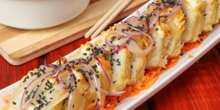 Cangrejo por dentro, envuelto en pepino por fuera con topping de Tampico y camarón empanizado