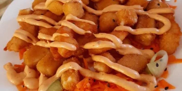 Por dentro relleno de arrachera capeada y camaron, empanizado por fuera un topping de queso gratinado conmbinado con salsa RED HOT, y rayado de ranch.