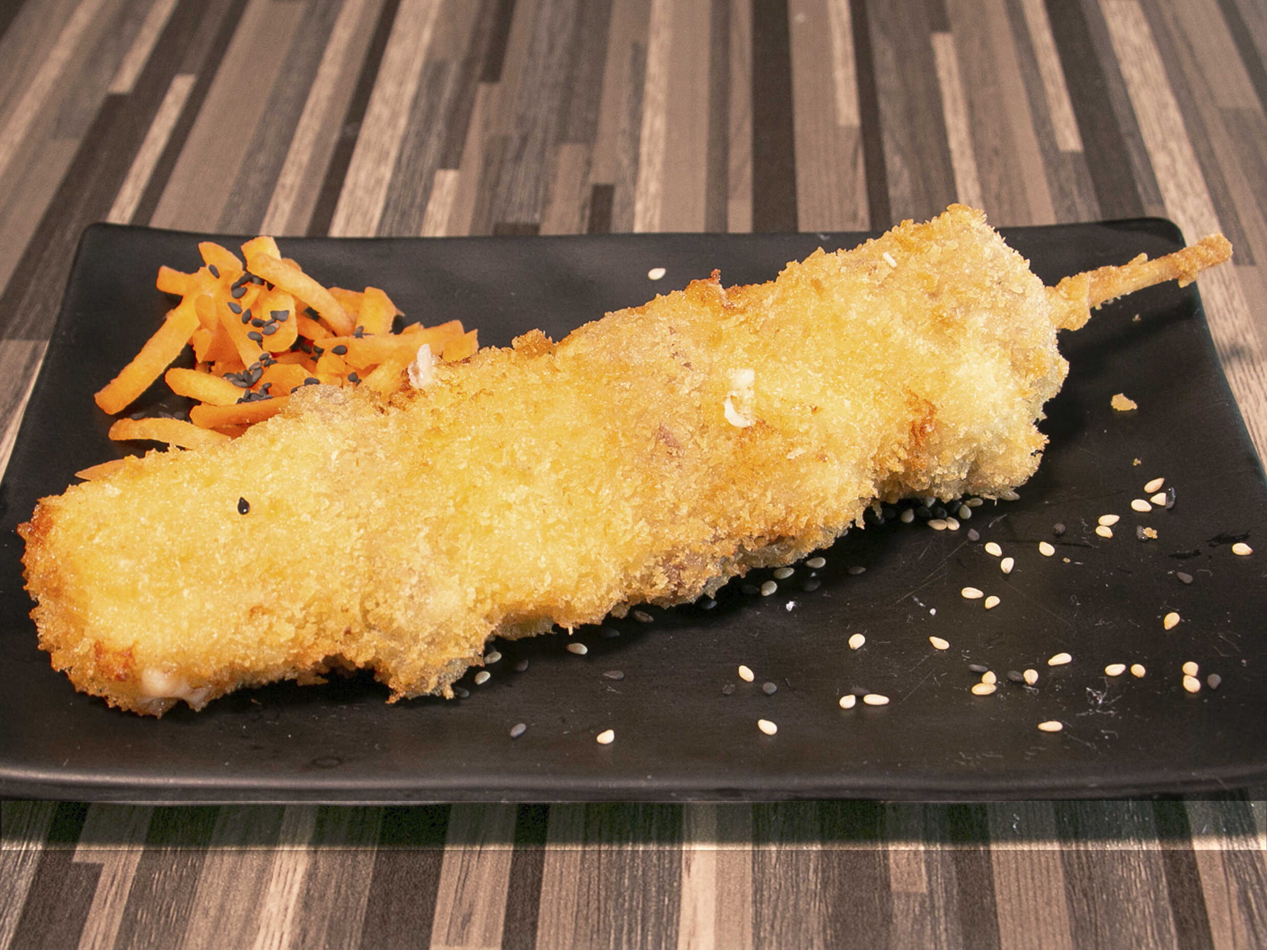 Una explodion de sabor, relleno de jugoso pollo sazonado, por fuera un capeado coronado de queso chiahia fundido, cebolla caramelizada y un toque de ajonjoli negro.