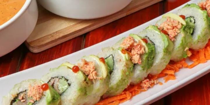 Queso philadelphia, pepino, aguacate y carne de res por dentro, forrado de aguacate, puntos de sriracha y tampico.