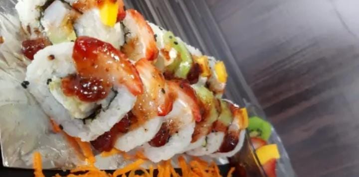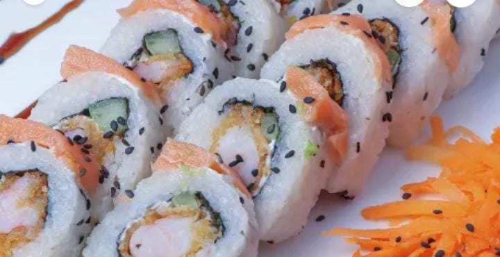 Relleno de aguacate, queso philadelphia, pepino y camarón empanizado, coronado de salmón y un toque de ajonjolí negro y salsa de anguila.
