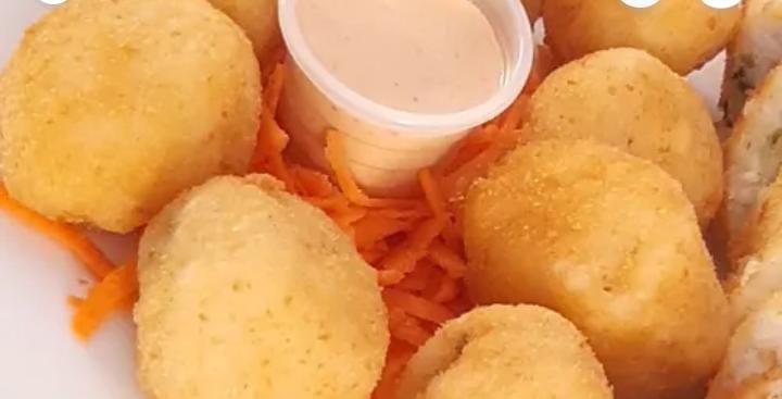 8 Esferas de arroz, rellenas de philadelphia y además pollo, arrachera o camarón.