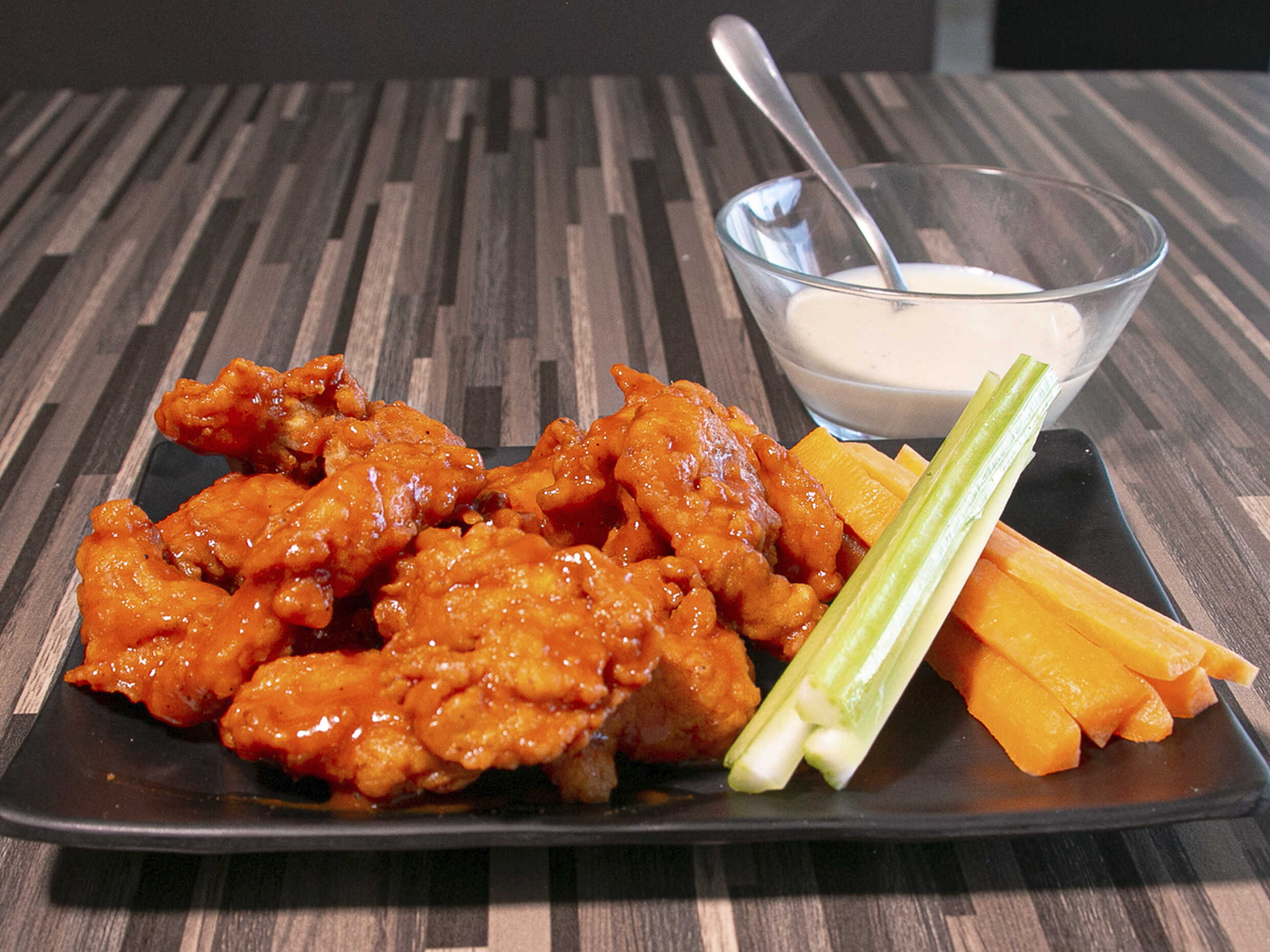 250 gramos de los mas crujientes boneless cubiertos de la salsa de tu elección.