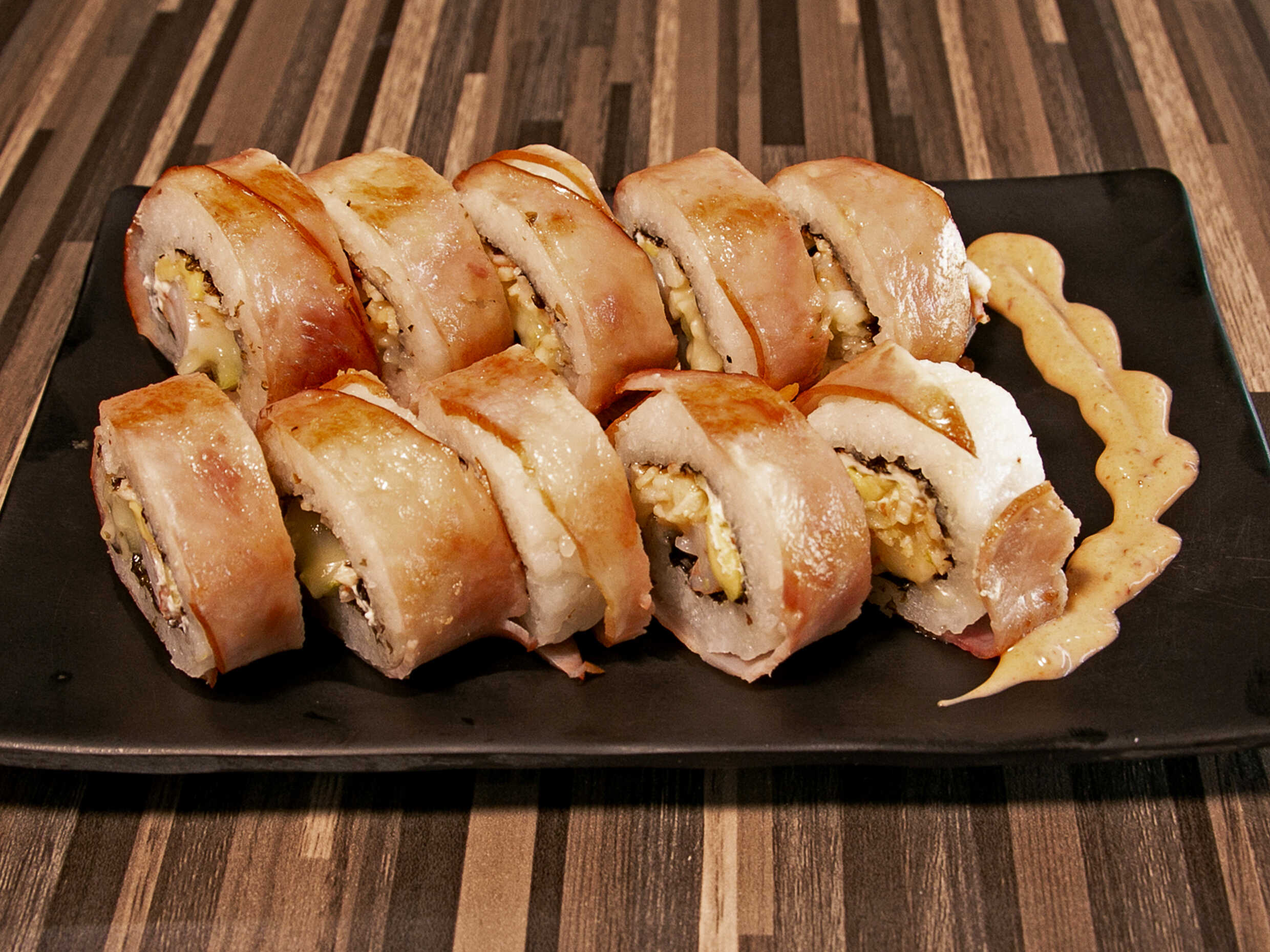 Relleno de queso Philadelphia, pepino, aguacate y camarón con cremoso tampico y queso chihuahua, por fuera un forrado de delicioso tocino frito.