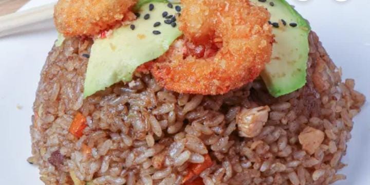 Arroz frito, sazonado con verduras y pechuga de pollo, arrachera, coronado con philadelphia, aguacate, tampico y camarón empanizado.