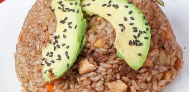 Arroz frito, sazonado con verduras, pollo y arrachera, coronado con philadelphia y aguacate.
