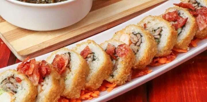 (10 bocados, Platillo personal) Delicioso en excelencia con camarón, arrachera y un crujiente tocino por fuera.(200gr), aderezos (Chipotle, salsa de soya)