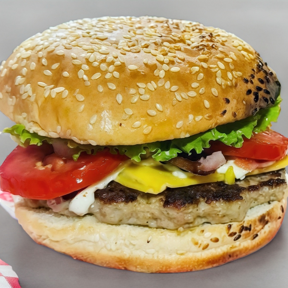 Pan con ajonjolí, DOBLE carne para hamburguesa, queso americano, mayonesa, catsup, chiles, lechuga y jitomate.