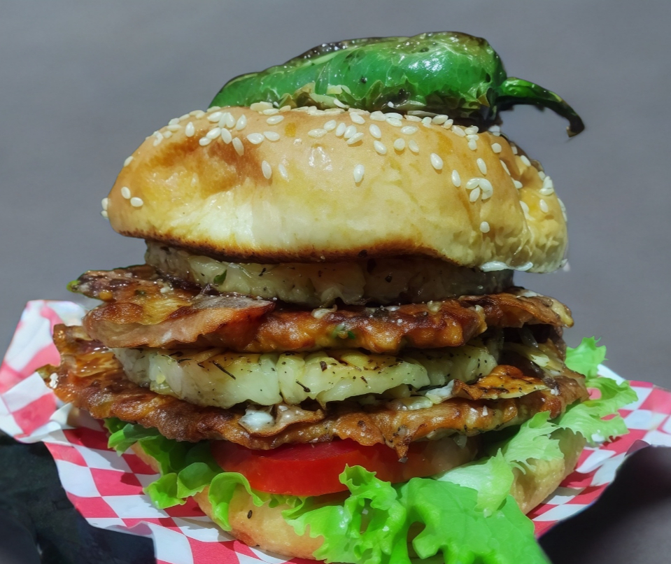Pan con ajonjolí, carne para hamburguesa, queso americano, piña, mayonesa, catsup, chiles, lechuga y jitomate.