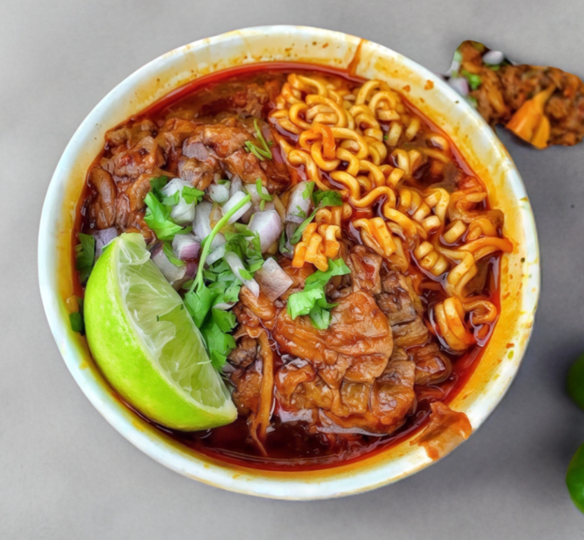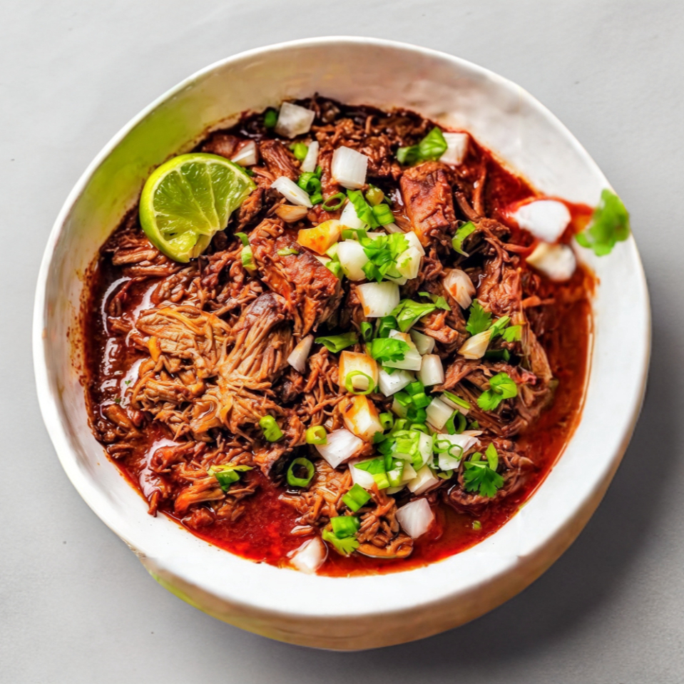 1 litro de consomé con 200gr de carne de birria. (Incluye tortillas, verdura, limón y salsa)
